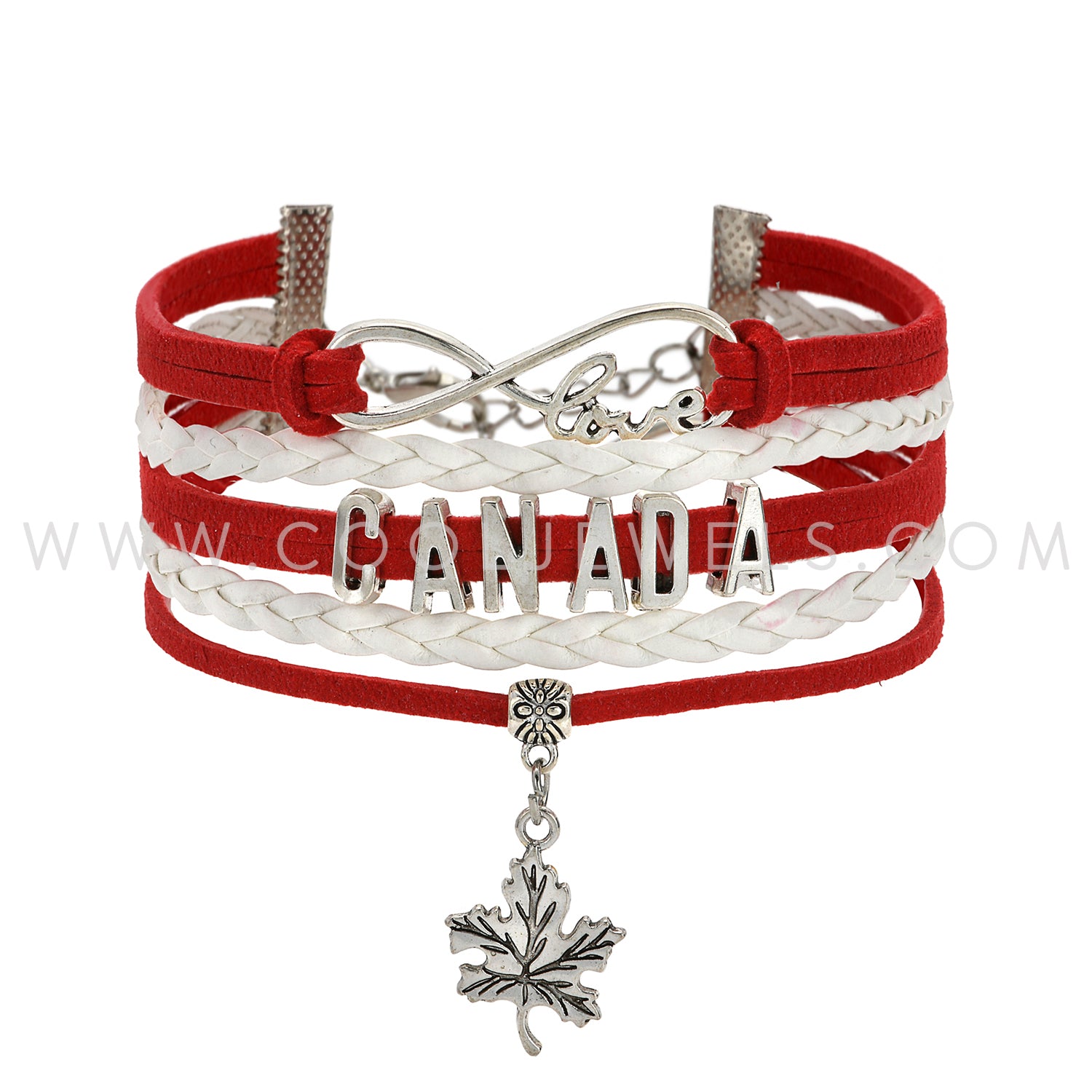 These Red & White w/ Canada & Maple Leaf Bracelet features a red and white bracelet with letters that spell out CANADA, silver love pendant, and a hanging maple leaf pendant.