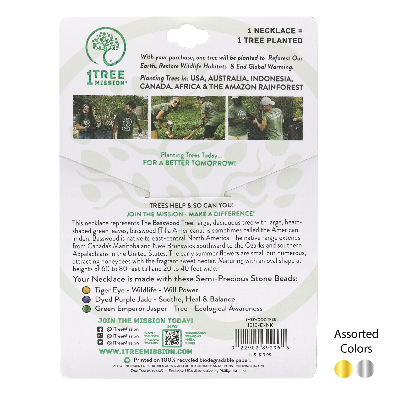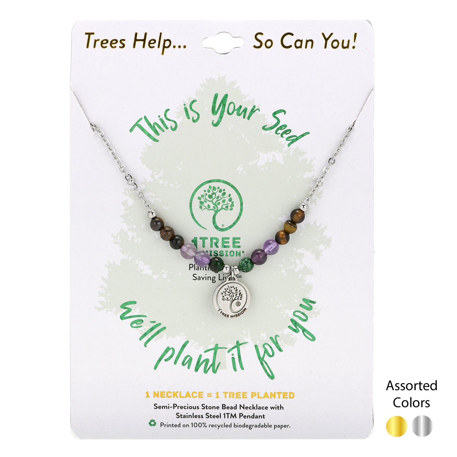 1 TREE MISSION®STAINLESS STEEL NECKLACE WITH COLORED BEADS (BLACK WALNUT TREE)