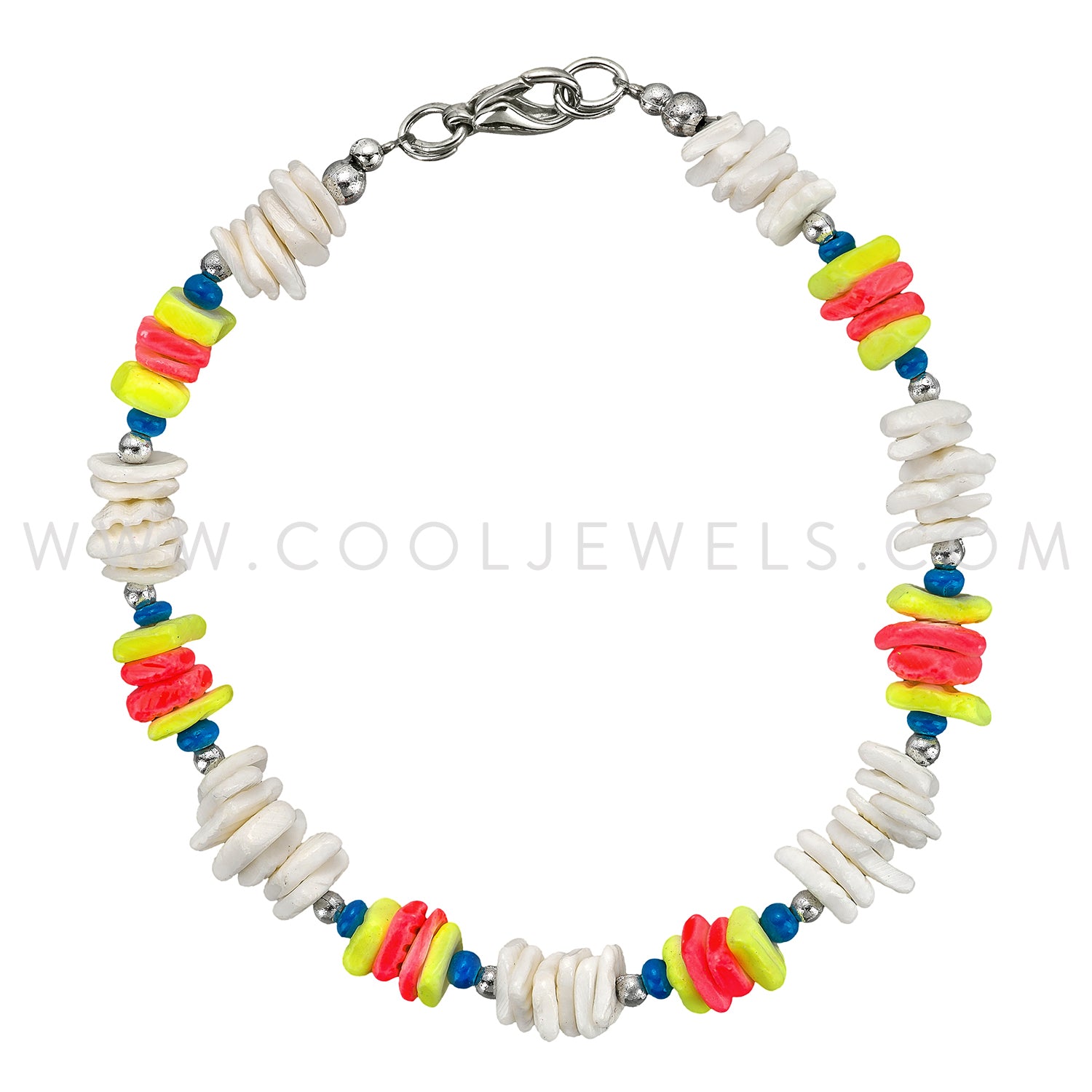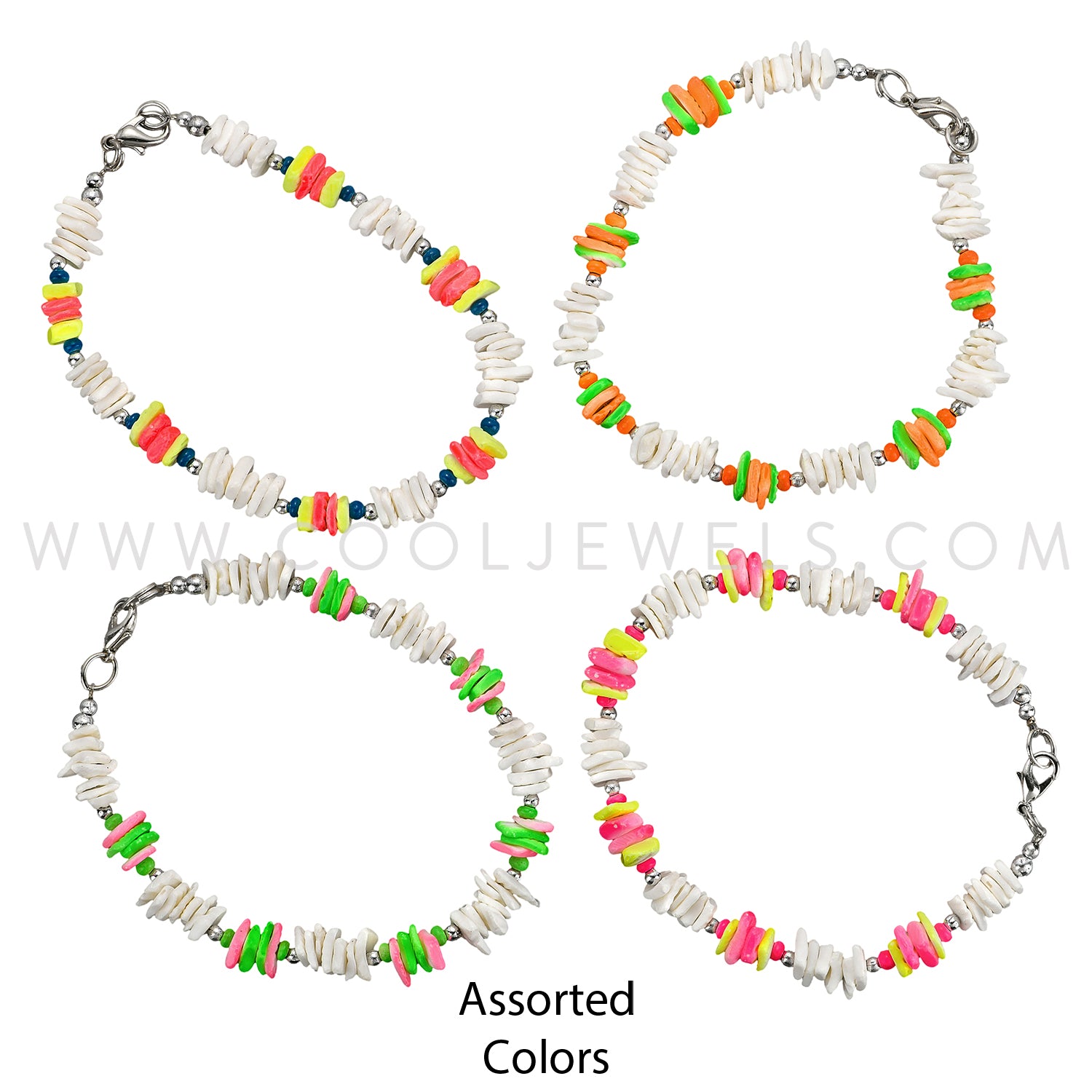 This Assorted Color White Neon Beaded Bracelets features silver beads, white shell and assorted neon shell colors within each dozen.