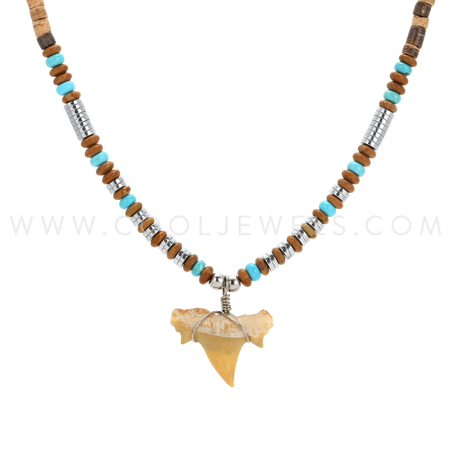 WOOD BEADED NECKLACE WITH COLORED SHELL & SHARK TOOTH PENDANT