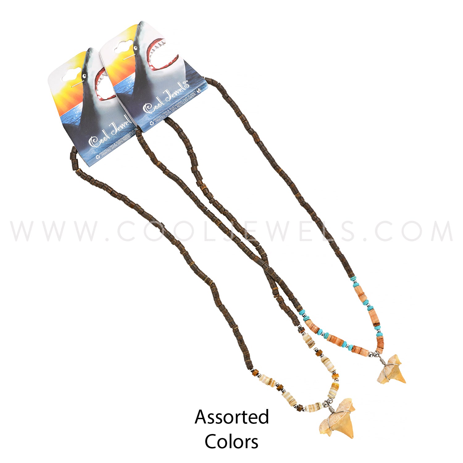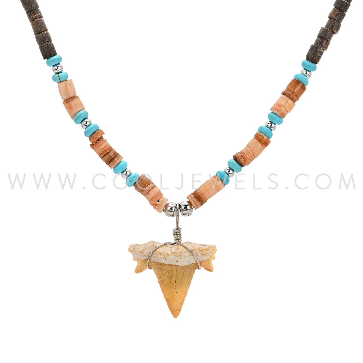 WOOD BEADED NECKLACE WITH HEISHI SHELL BEADS & SHARK TOOTH PENDANT