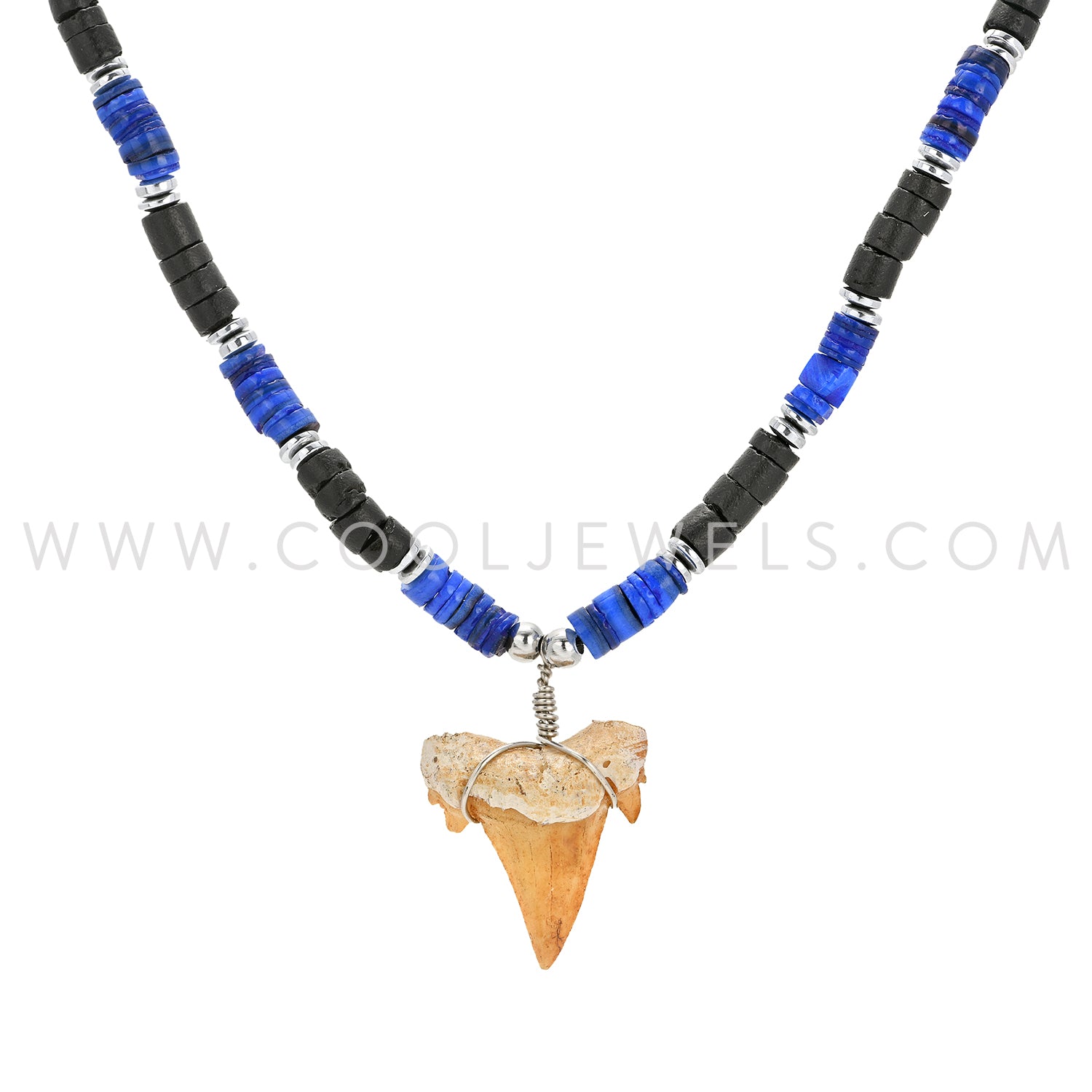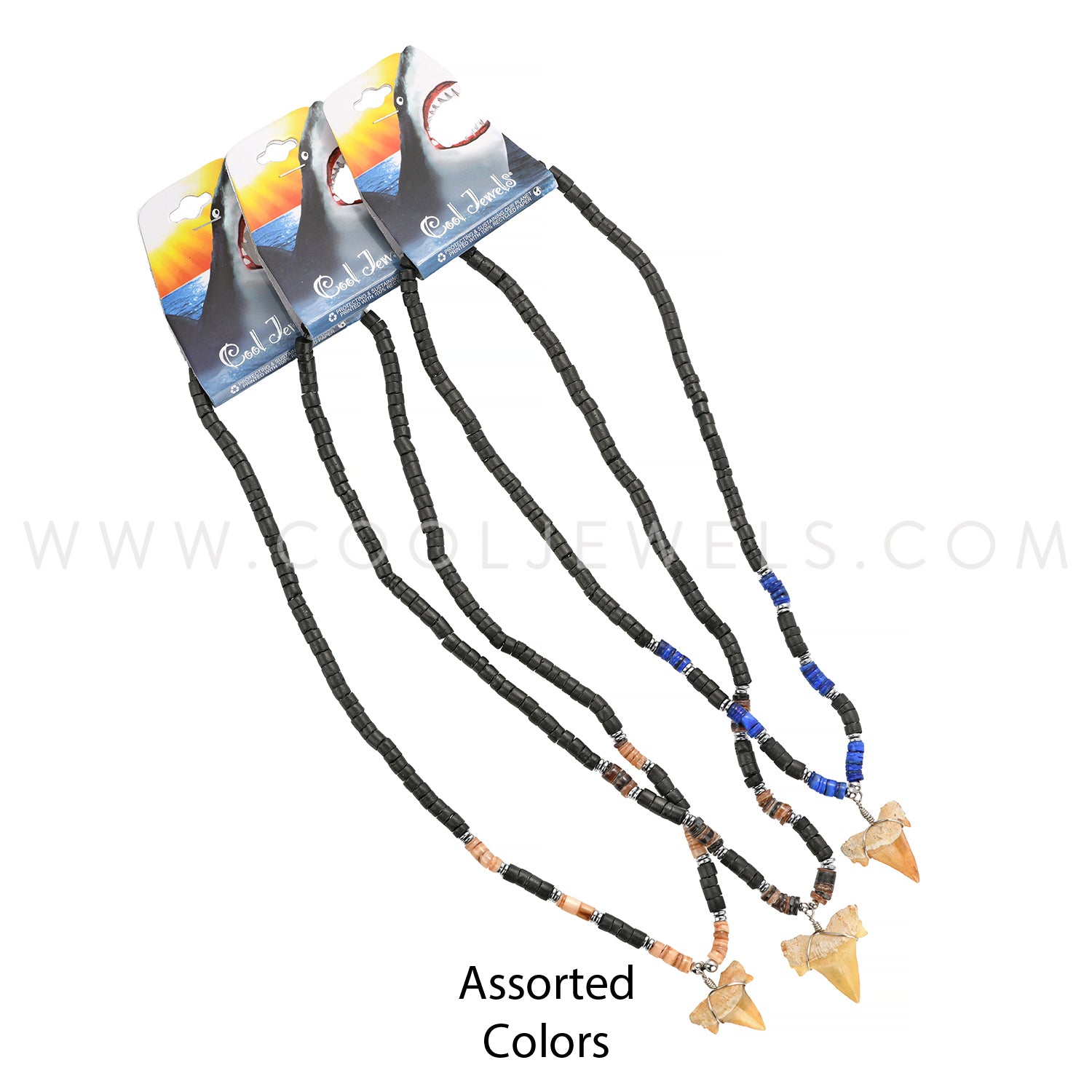WOOD BEADED NECKLACE WITH HEISHI SHELL BEADS & SHARK TOOTH