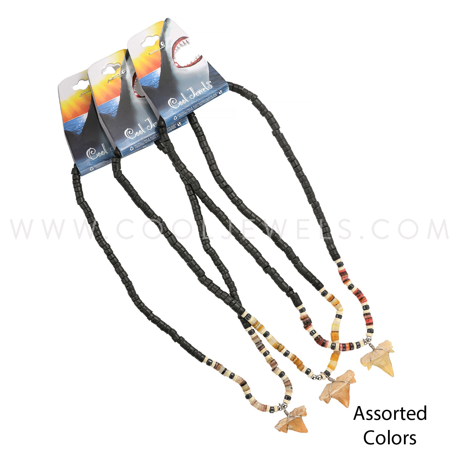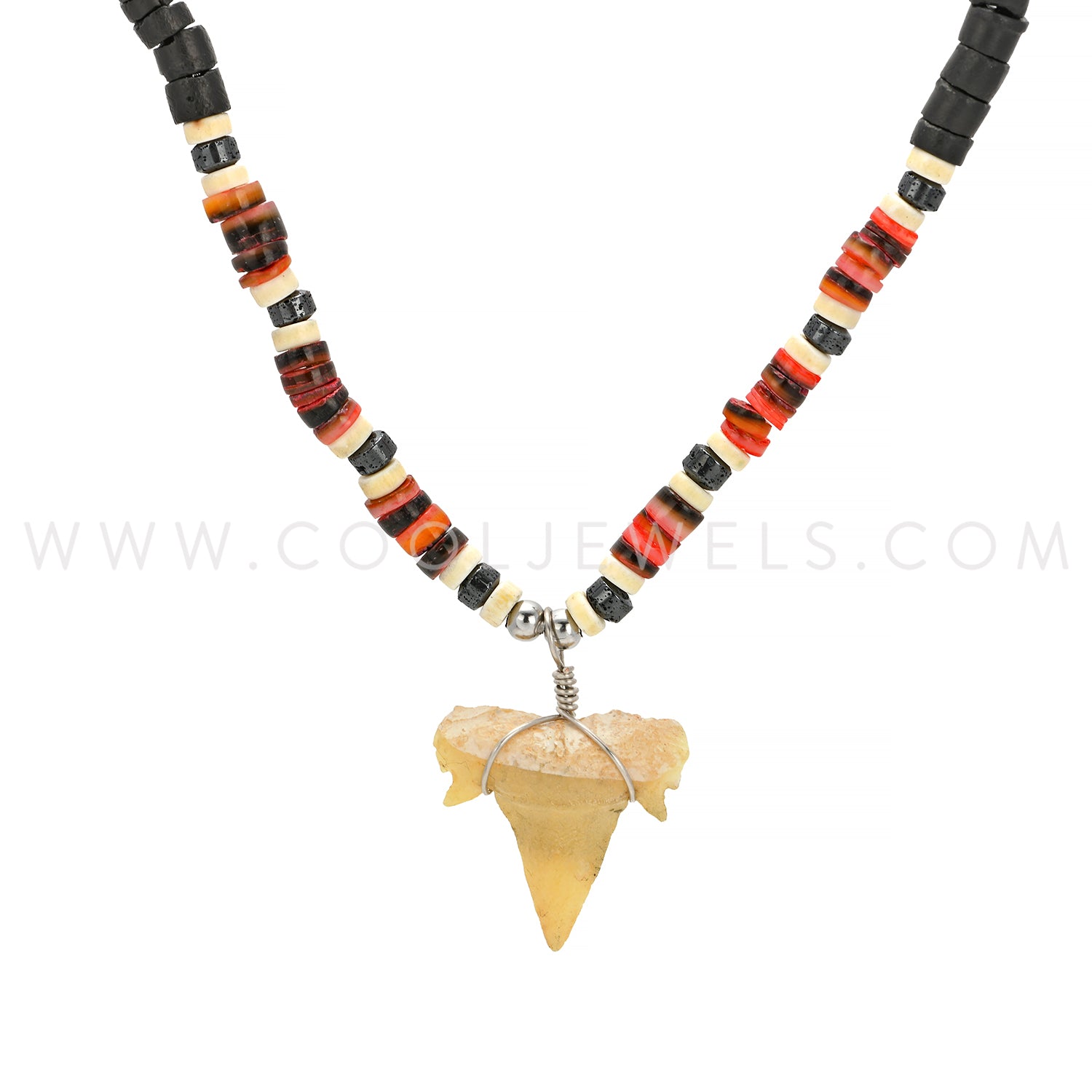 WOOD BEADED NECKLACE WITH COLORED HEISHI SHELL BEADS & SHARK TOOTH PENDANT