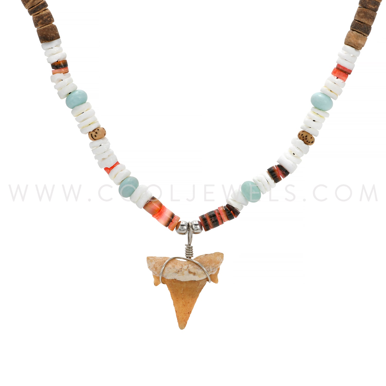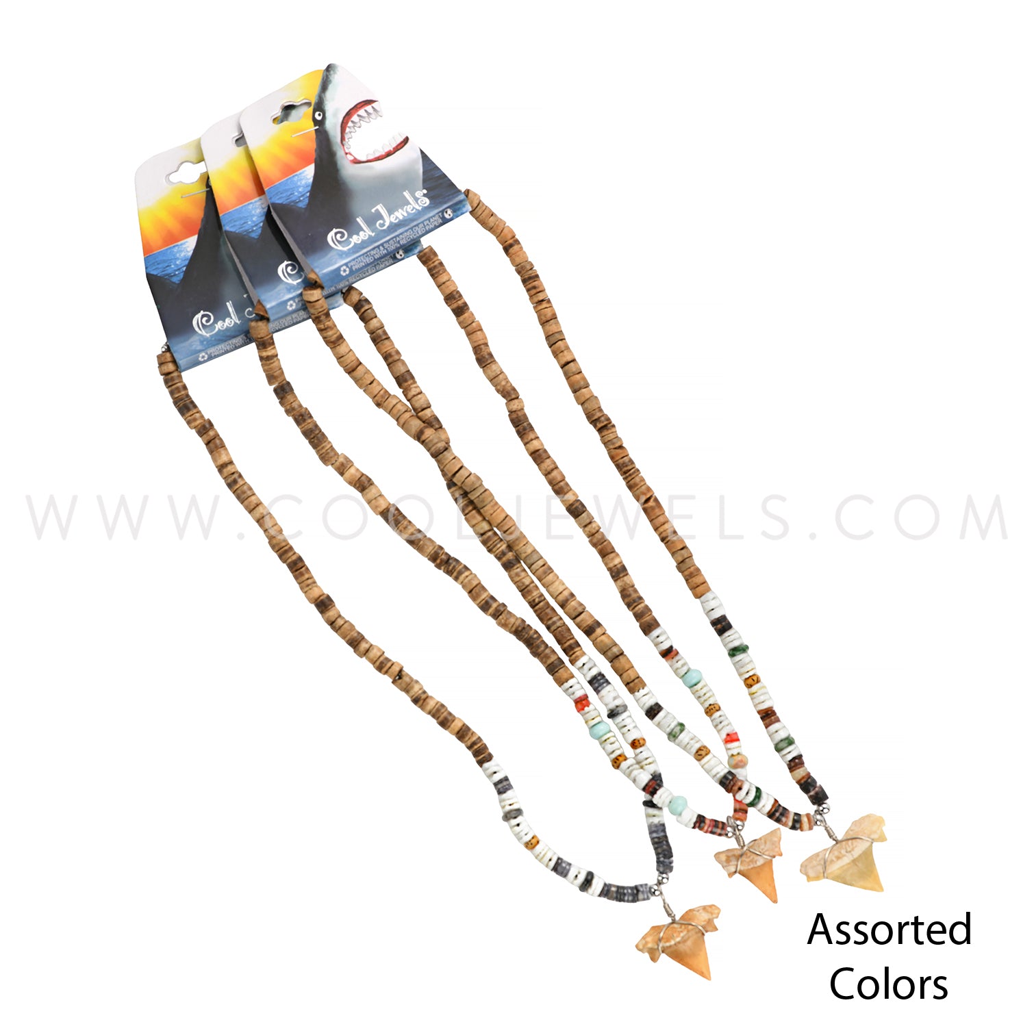 BROWN WOOD BEADED NECKLACE WITH COLORED HEISHI SHELL/STONE BEADS & SHARK TOOTH PENDANT