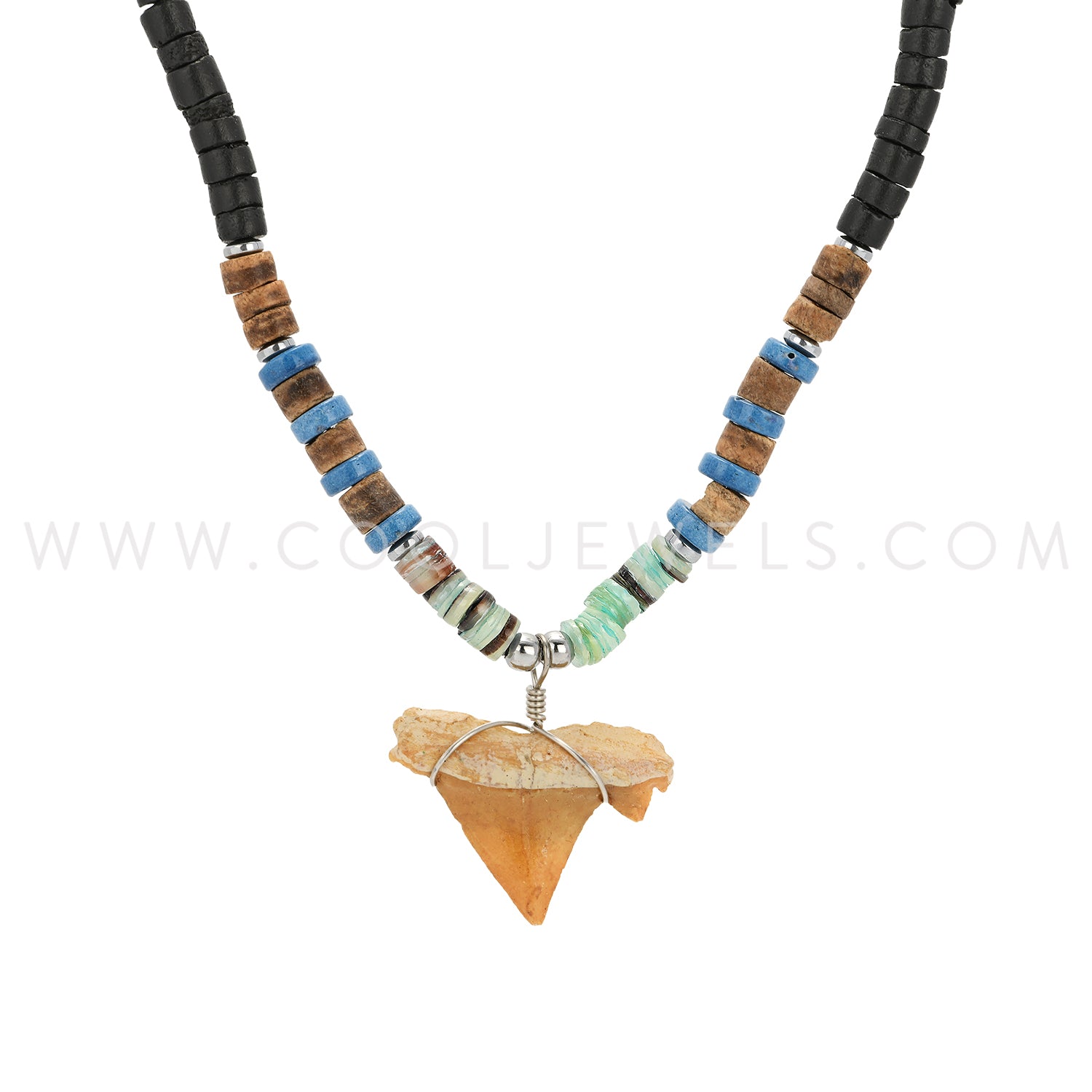 WOOD BEADED NECKLACE WITH COLORED HEISHI SHELL BEADS & SHARK TOOTH PENDANT