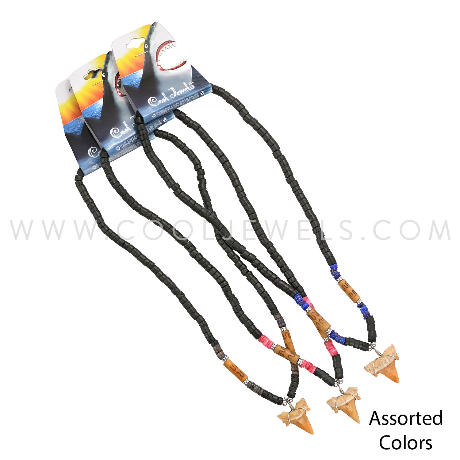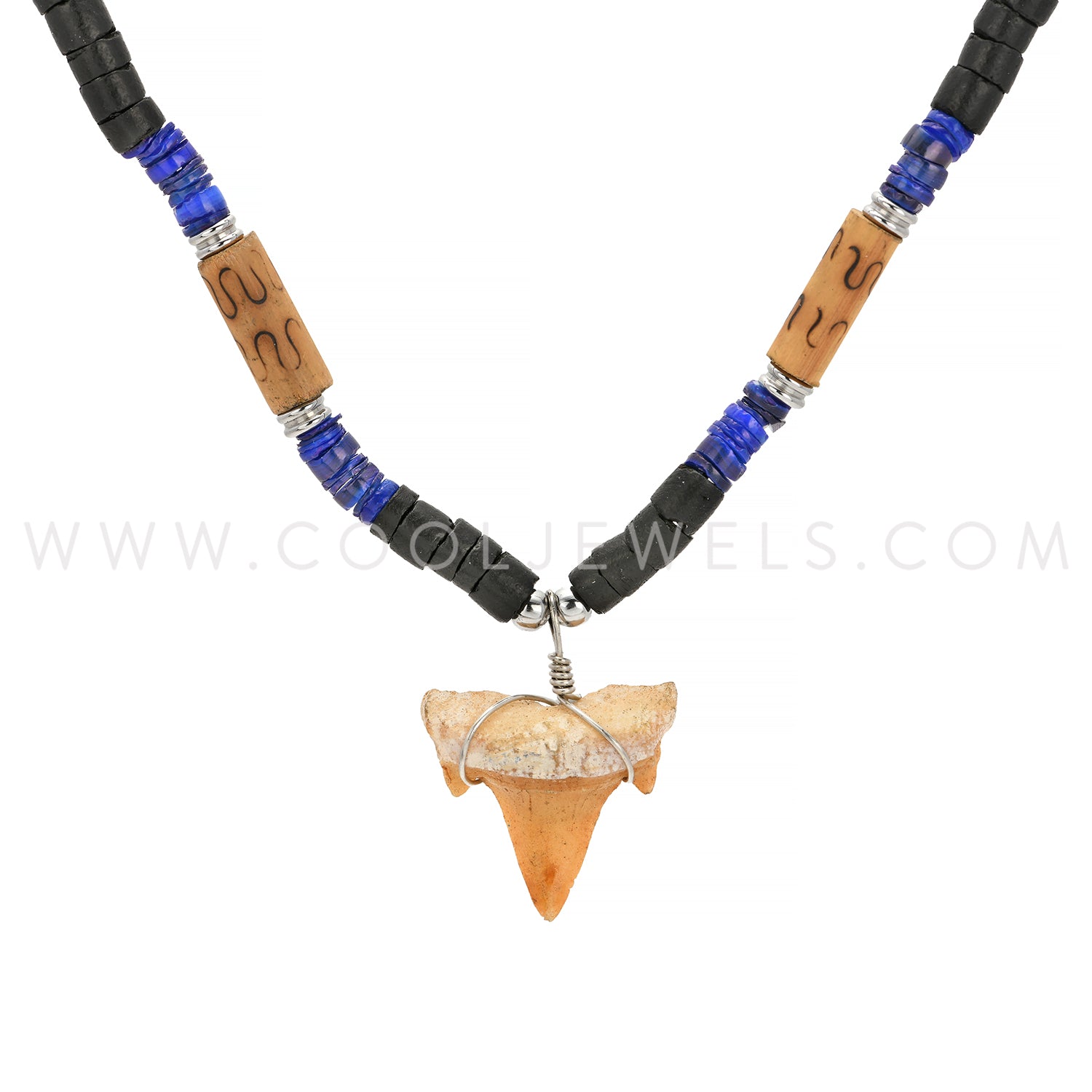 BLACK WOOD BEADED NECKLACE WITH BONE TUBES & HEISHI SHELL BEADS & SHARK TOOTH
