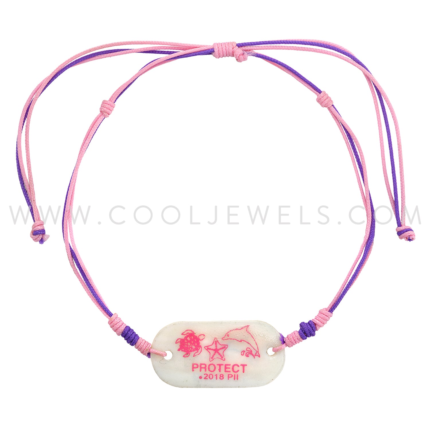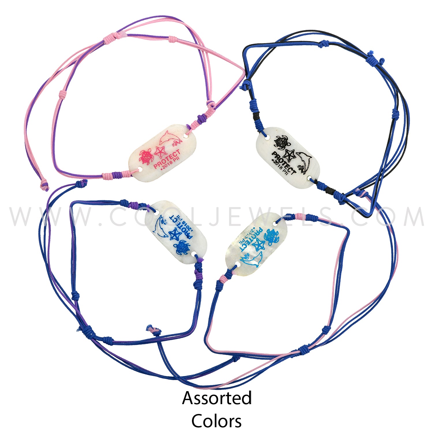 These Assorted Pink, Blue & Black "Protect", Dolphin, Sea Turtle & Starfish Slider Cord Bracelet/Anklet features a double colored Pink/Purple, Pink/Blue, or Black/Blue slider cord bracelet/anklet with "Protect", dolphin, sea turtle, & starfish pendant.
