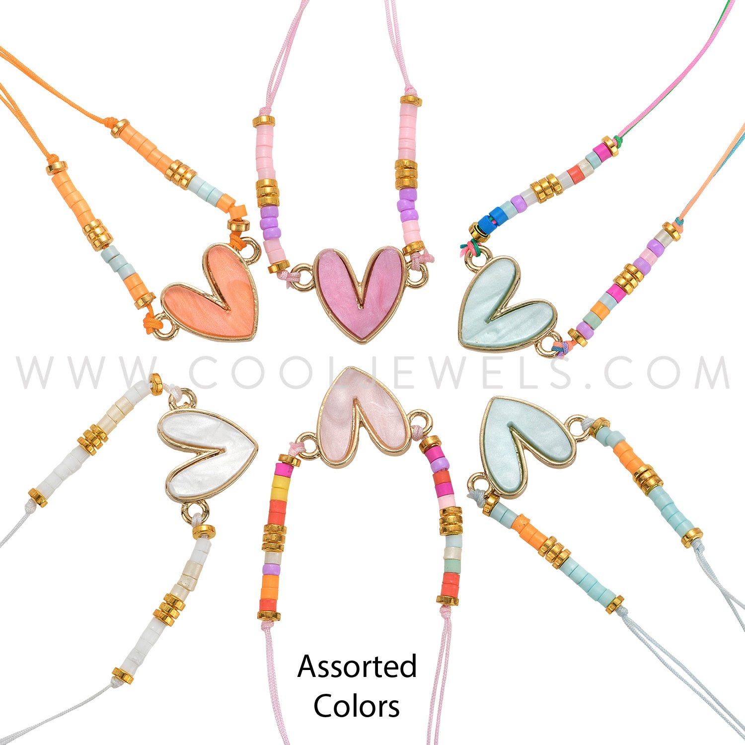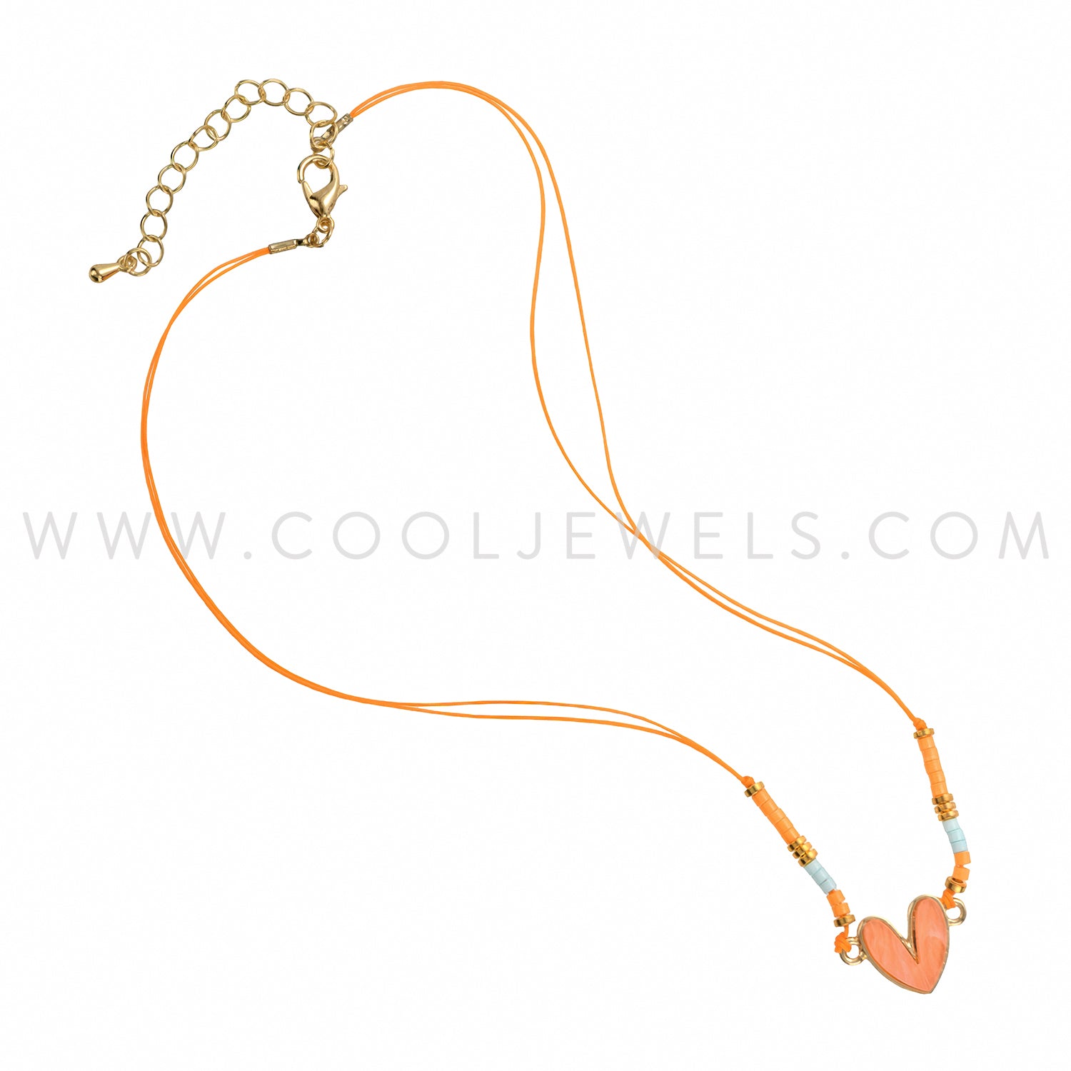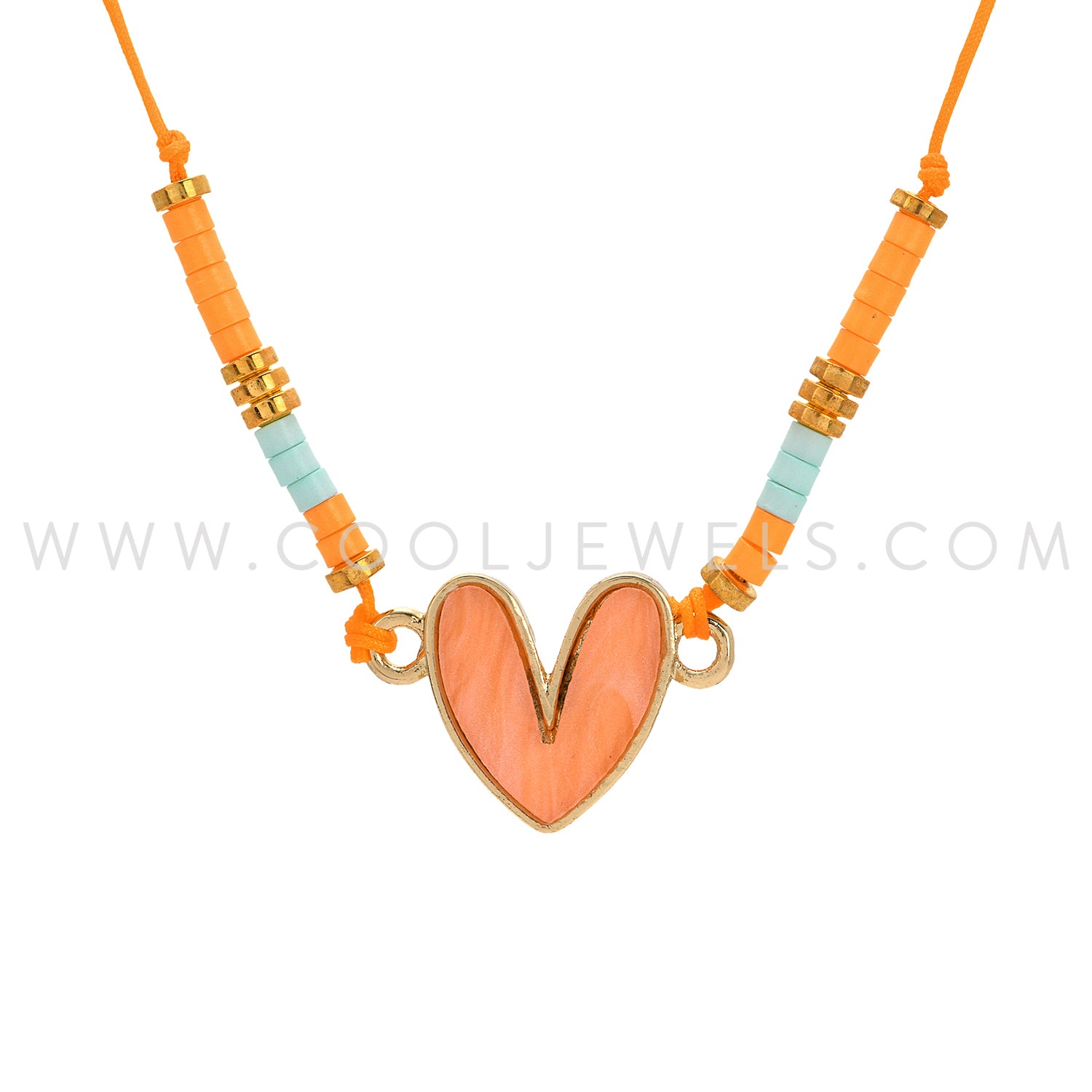 COLOR CORD NECKLACE WITH SEED BEADS AND IRREGULAR HEART SHAPED PENDANT