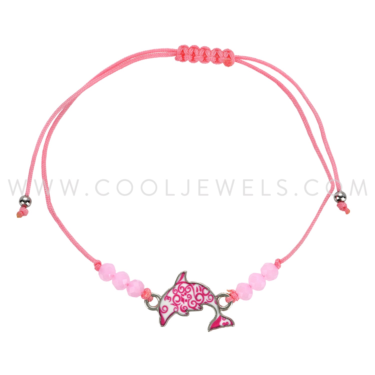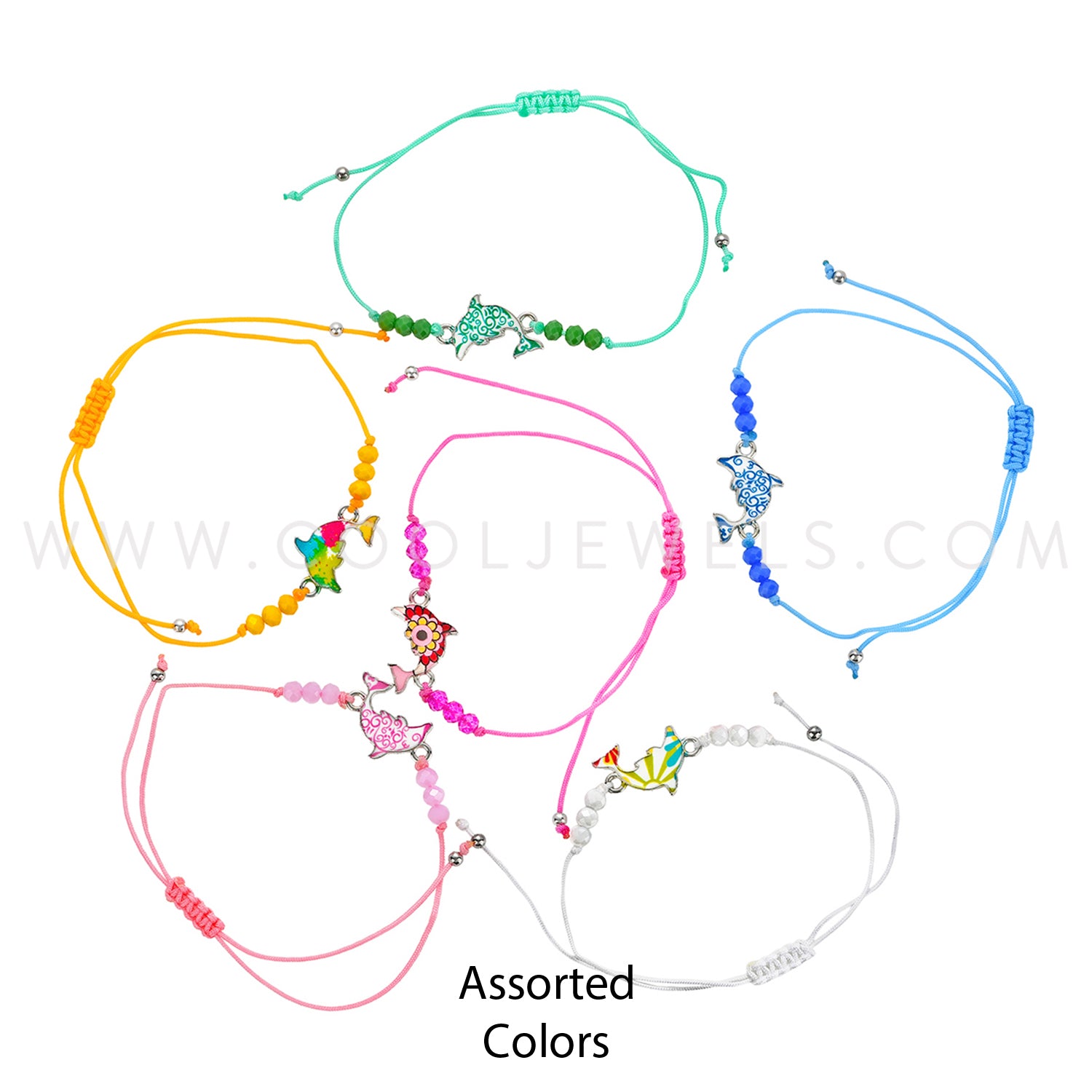These Assorted Dolphin & Colored Beaded Bracelet features a variety of different colors and patterned dolphin pendant with colored beads on a twine slider bracelet for easy sizing. Each dozen comes with a variety of different colored dolphin and bracelets.