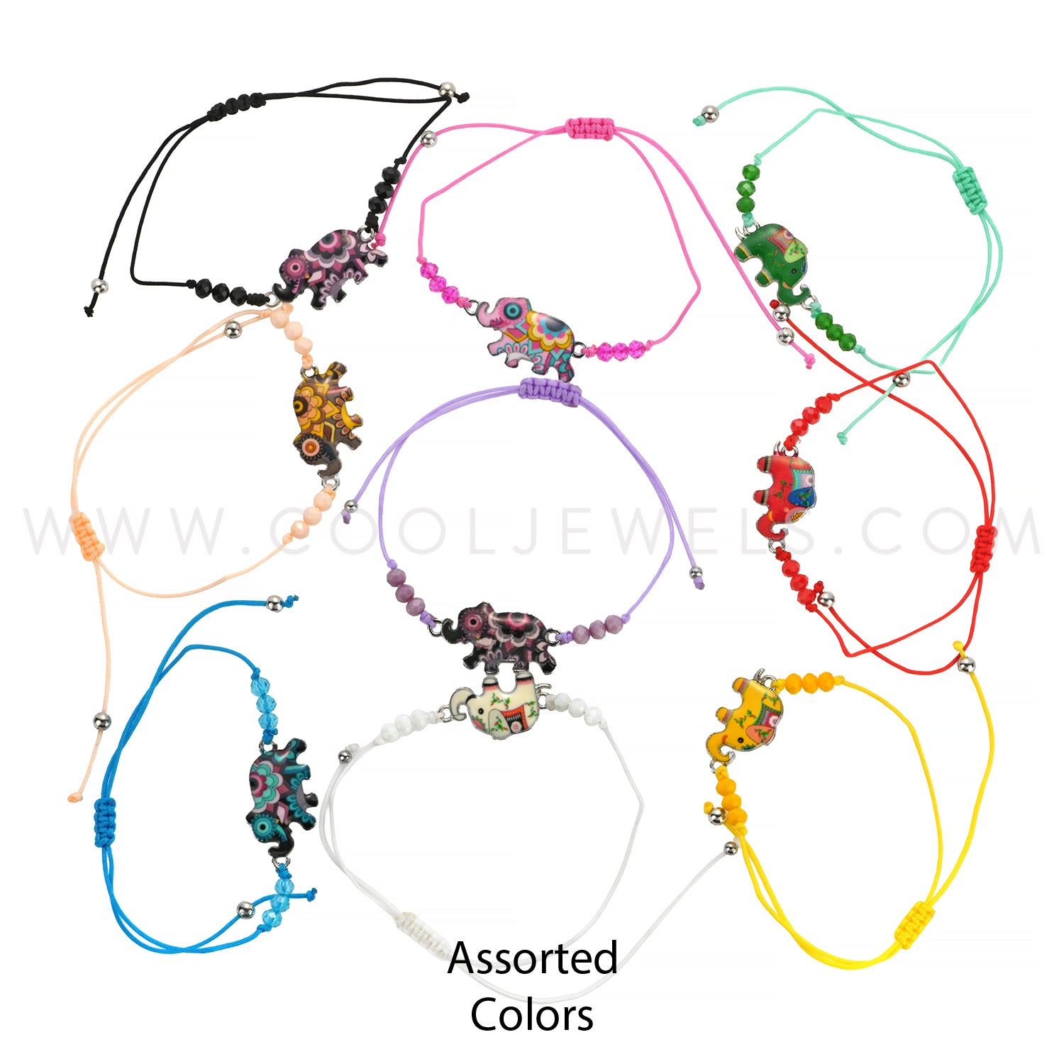 These Assorted Elepahnt & Colored Beaded Bracelet features a variety of different colors and patterned elephant pendant with colored beads on a twine slider bracelet for easy sizing. Each dozen comes with a variety of different colored elephant and bracelets.
