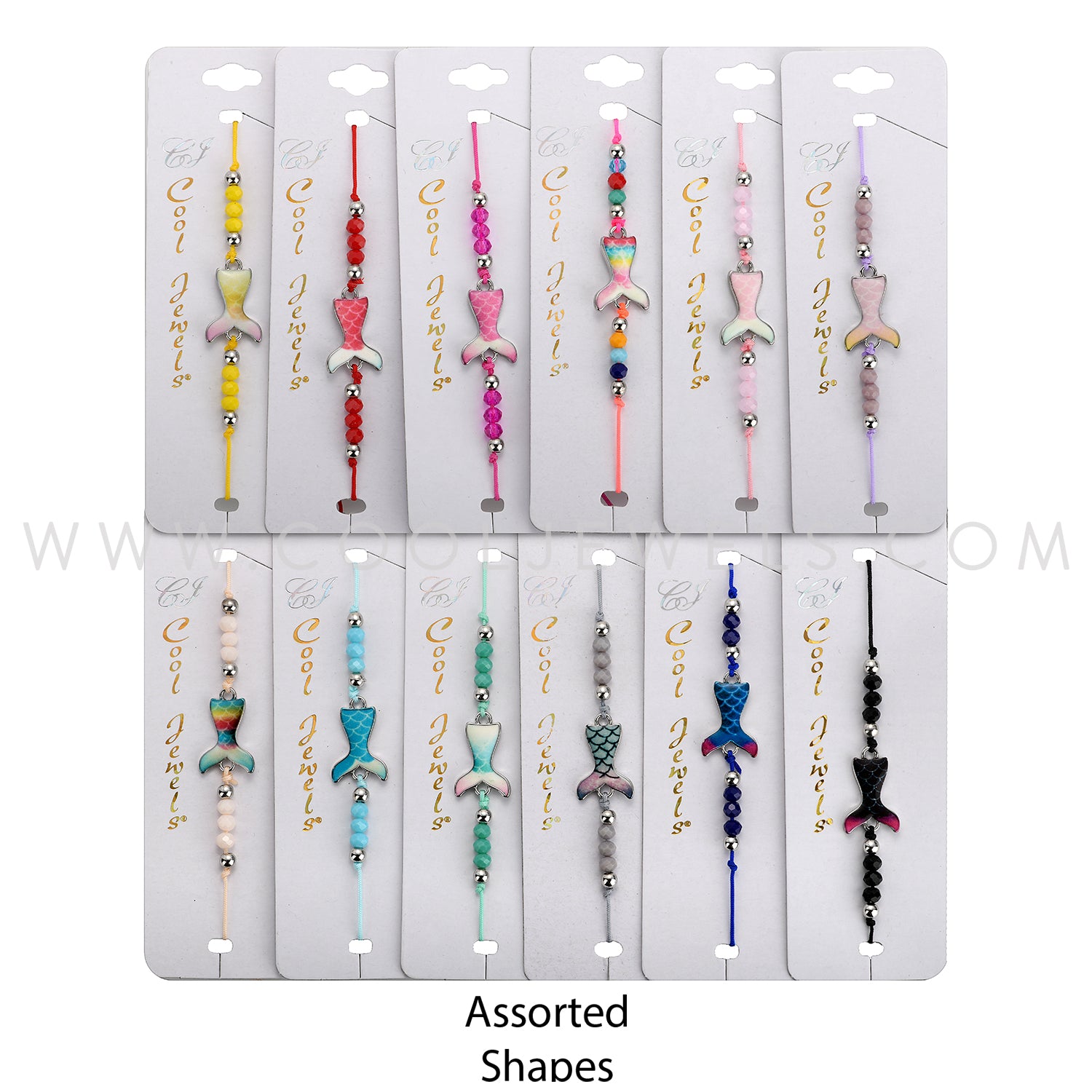 These Assorted Colored Mermaid Tail Stretch Bracelets features a cute enamel mermaid tail with colored accent beads on a colored stretch bracelet. Each dozen comes with a variety of different colored mermaid tail and bracelets.