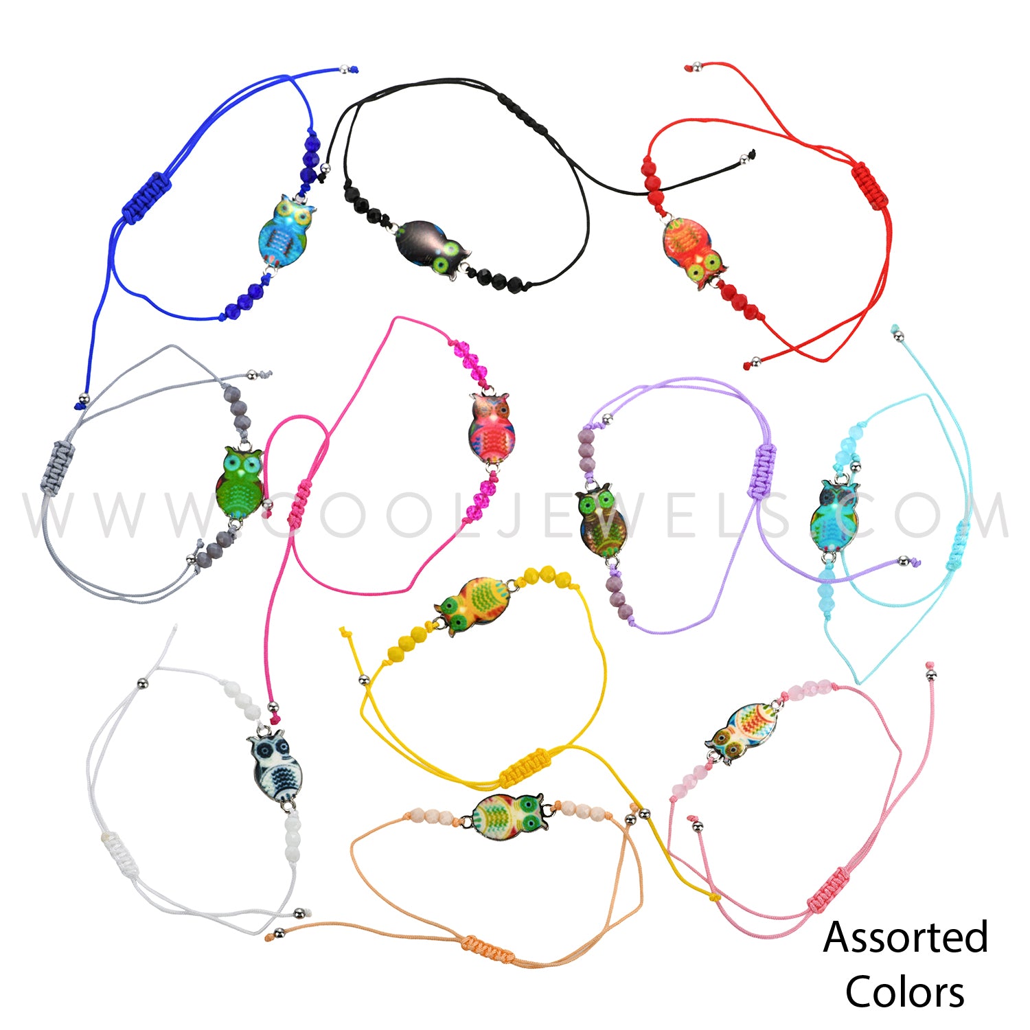 These Assorted Owl & Colored Beaded Bracelet features a variety of different colors and patterned Owl pendant with colored beads on a twine slider bracelet for easy sizing. Each dozen comes with a variety of different colored owl and bracelets.