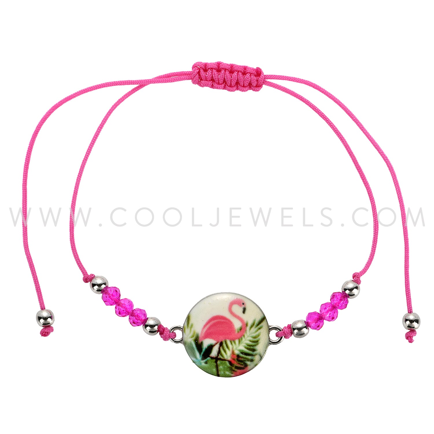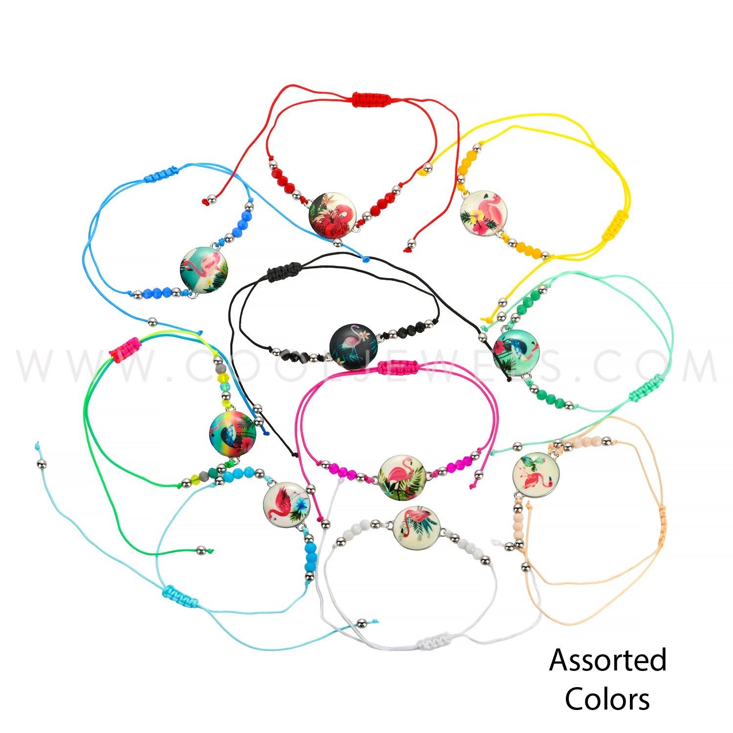 These Assorted Enamel Flamingo Slider Bracelet features a variety of colored enamel flamingo pendants on a colored slider cord bracelet for easy sizing. Each dozen comes with a variety of different colored flamingos & designs.