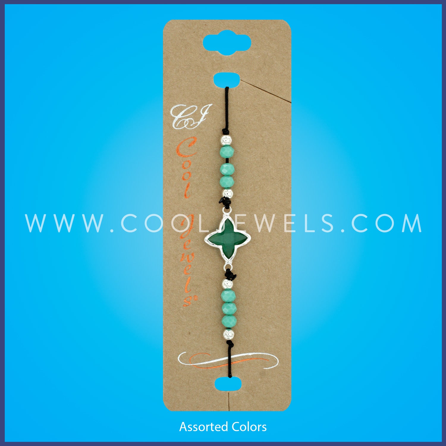 These Assorted Crystal Clover & Color Beaded Bracelets features a mixture of different colored gold crystal clover pendants with matching colored beads and gold accent beads on a colored twine slider bracelet.