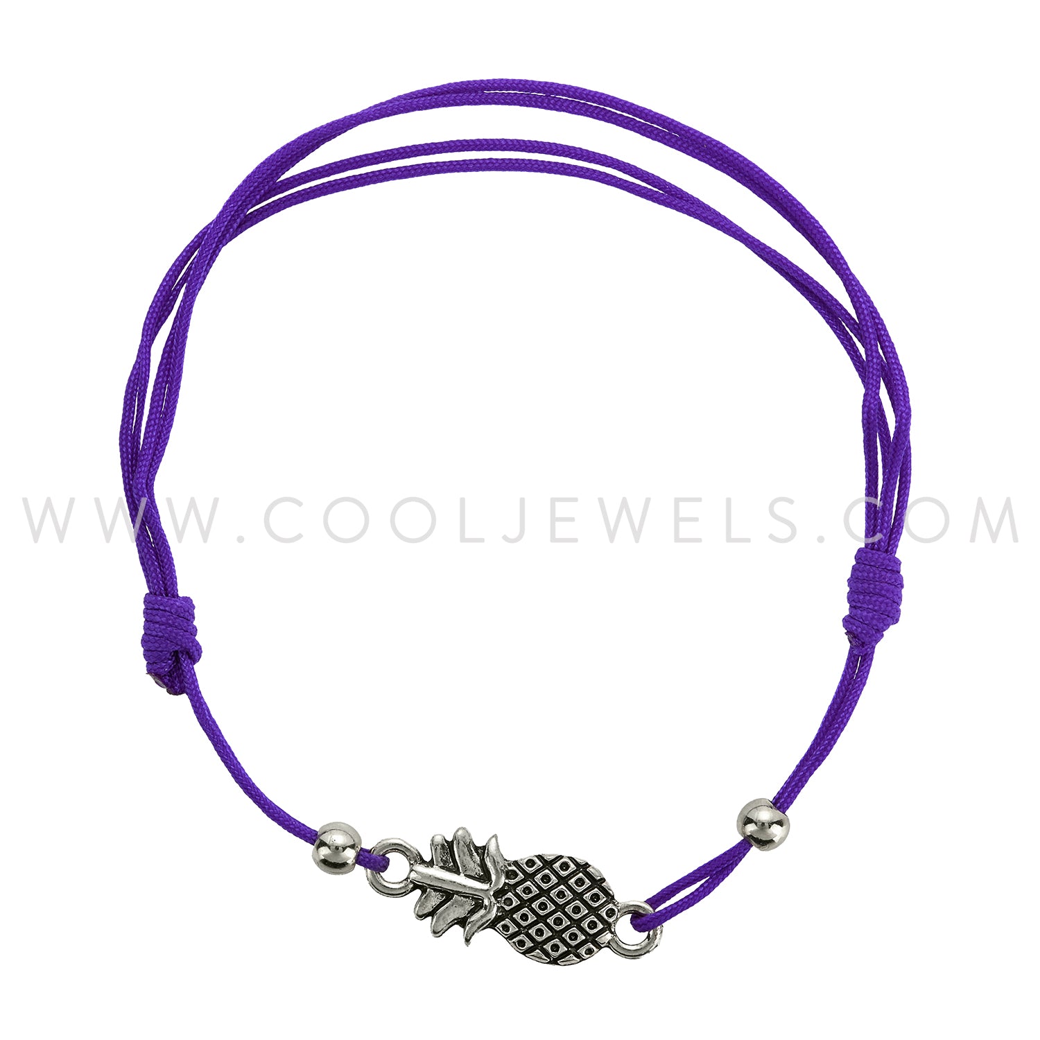 These Assorted Black, Purple, Red & Blue Pineapple Slider Cord Bracelets/Anklets features a silver pineapple pendant with silver accent beads on a slider cord bracelet/anklet for easy sizing.