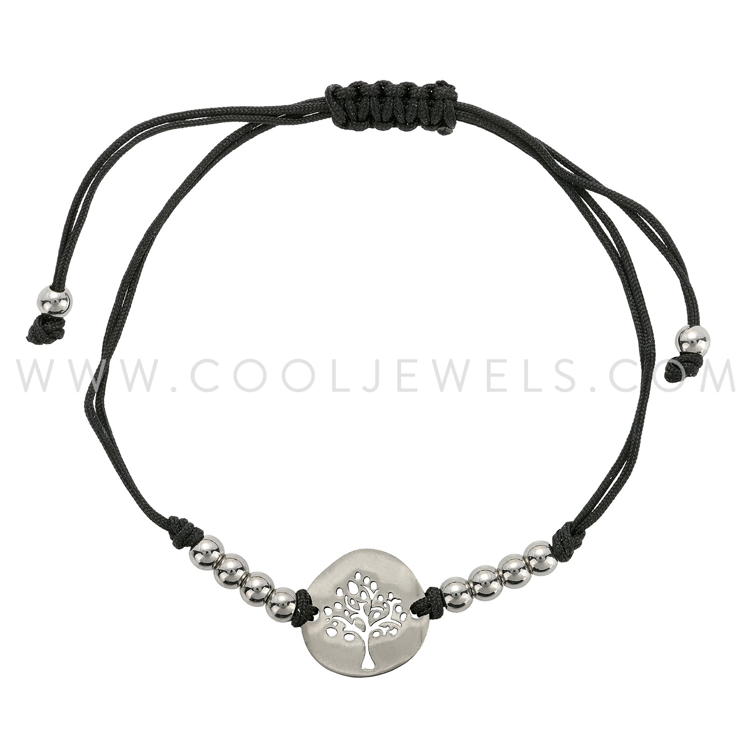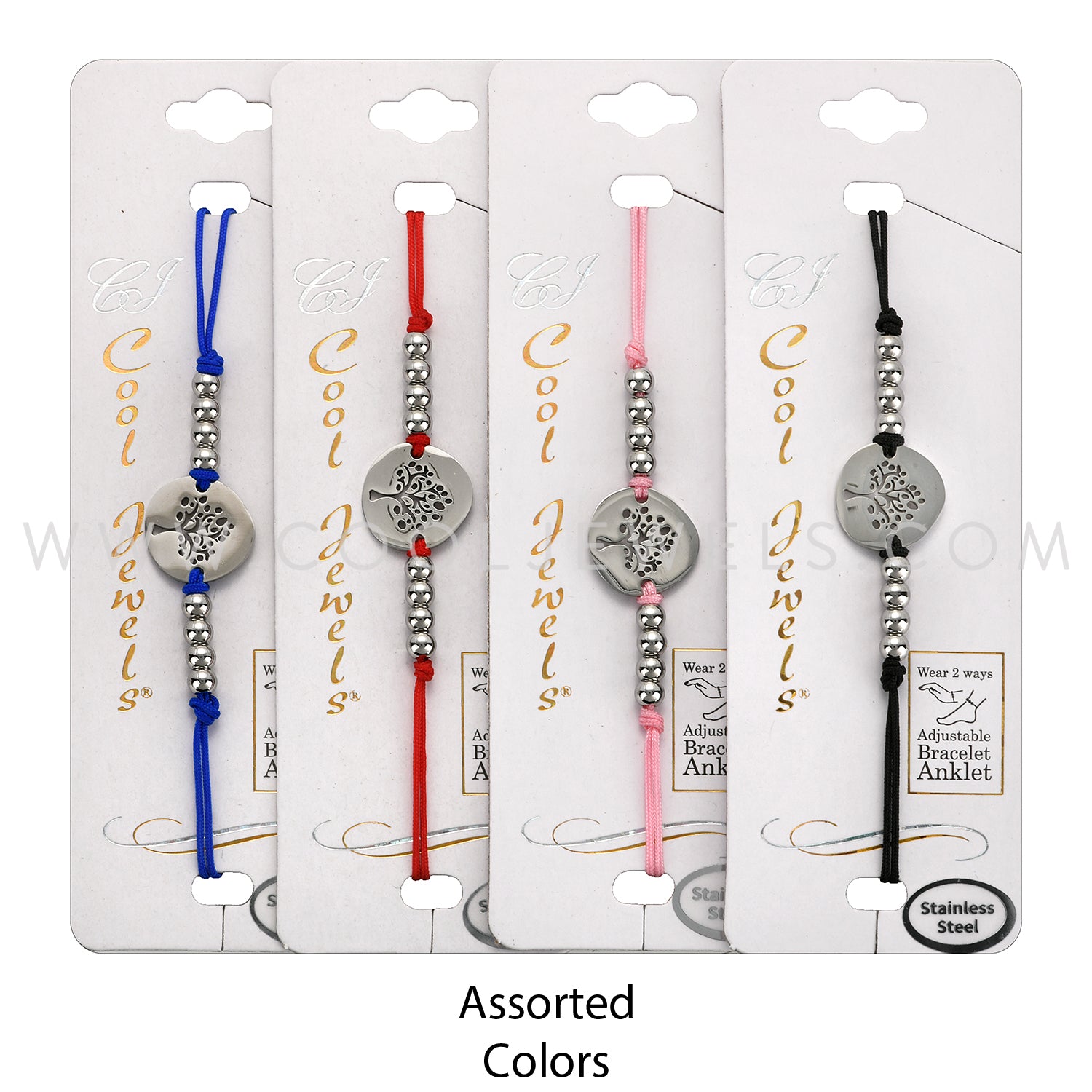 These Assorted Black, Red, Blue & Pink Silver Tree & Beads Anklet/Bracelet features a silver laser cut out tree with accent silver beads on a colored slider anklet / bracelet.