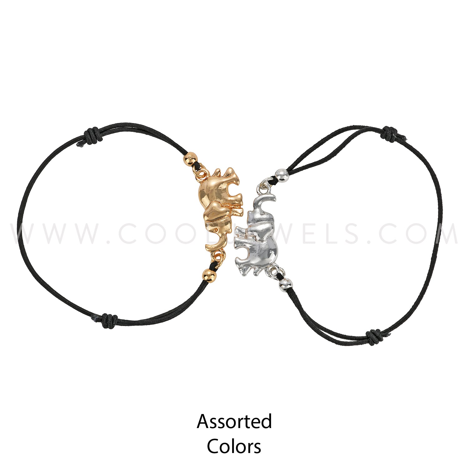These Assorted Gold & Silver Elephant Slider Cord Bracelets features an elephant pendant on a black slider cord bracelet for easy sizing.