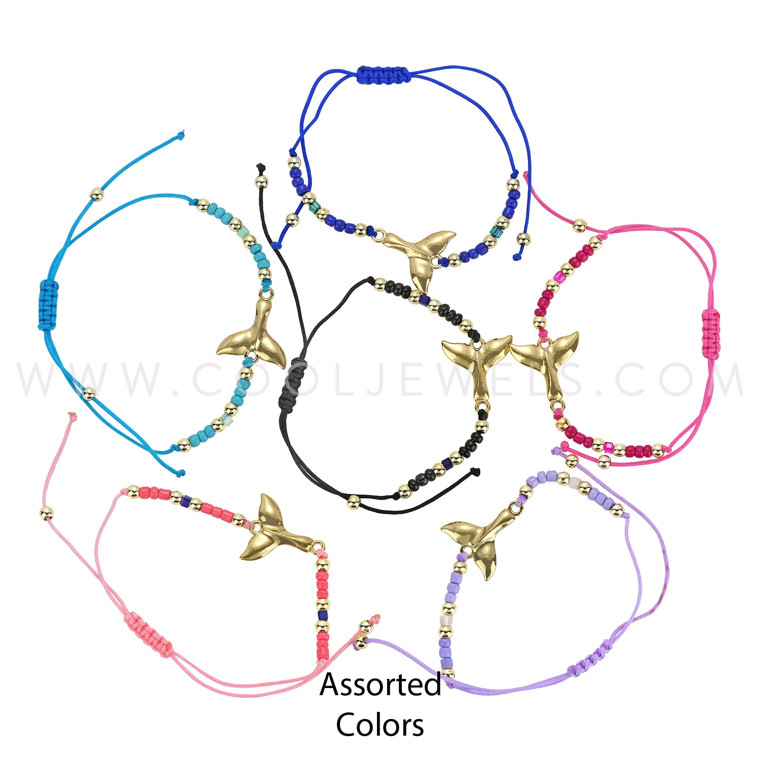 These Assorted Gold Whale Tail & Colored Beads Bracelets features a gold whale tail with colored beads on a colored slider cord bracelet for easy sizing.Each dozen comes with a variety of different colored beads & bracelets.
