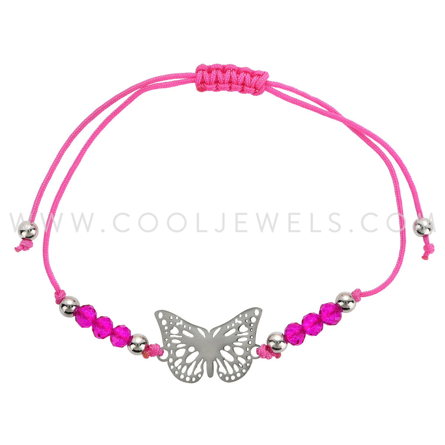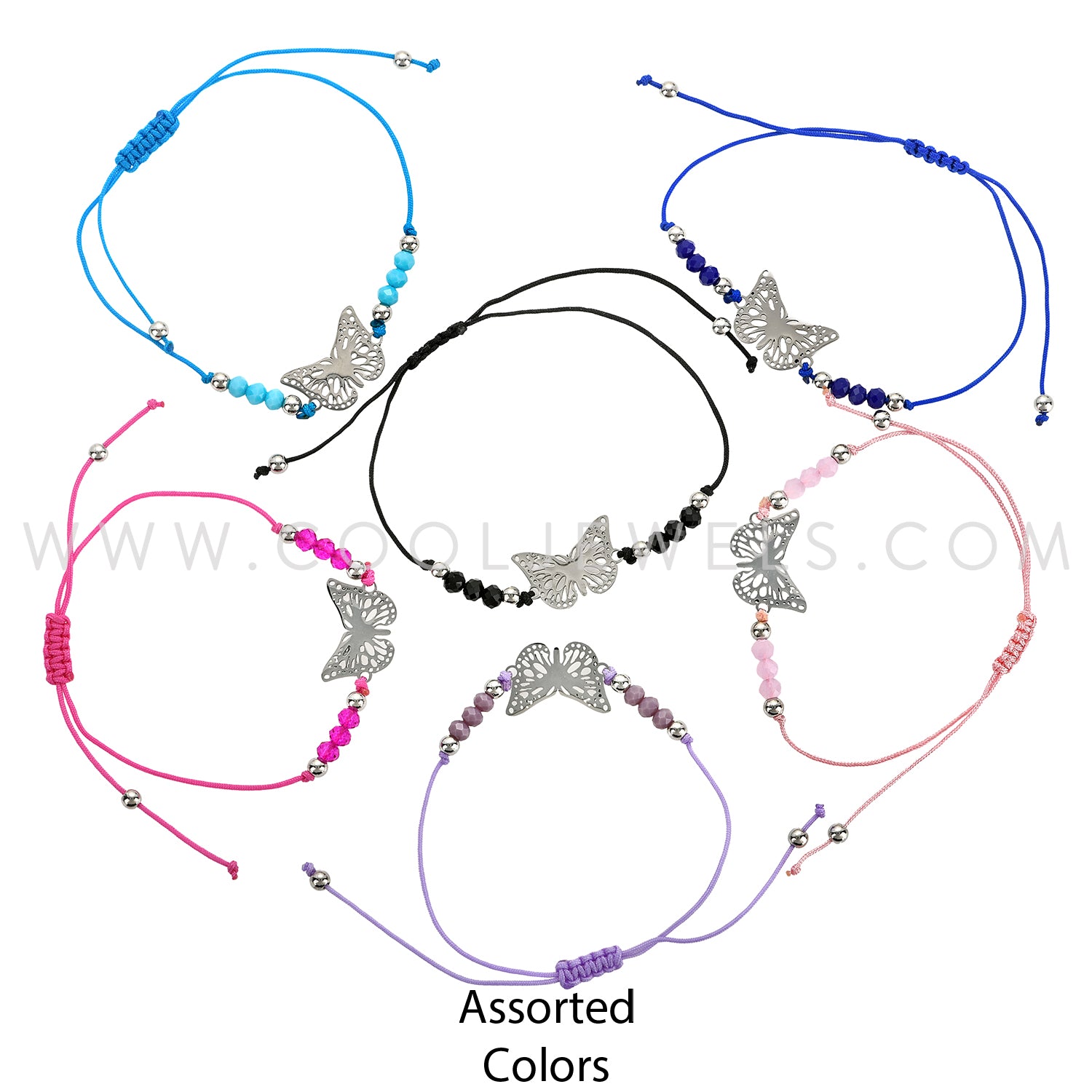 These Assorted Butterfly & Colored Beads Anklet features a silver butterfly laser cut out pendant with colored beads and silver accent beads on a slider cord anklet.