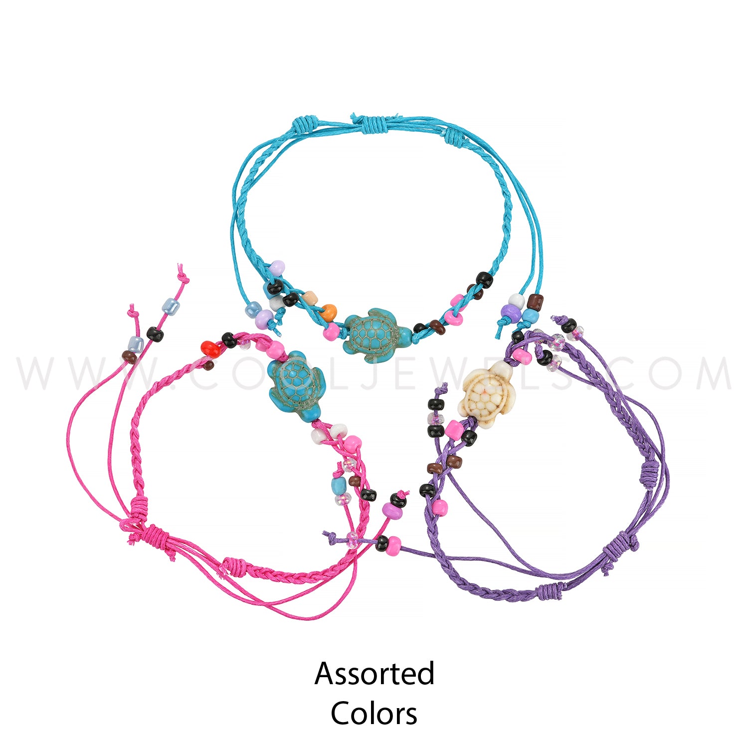 These Assorted Woven Colored Turtle Bracelets feature a variety of fun colored beads accented with a colored turtle pendant.