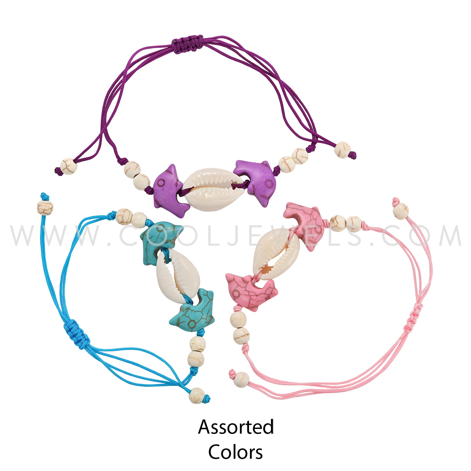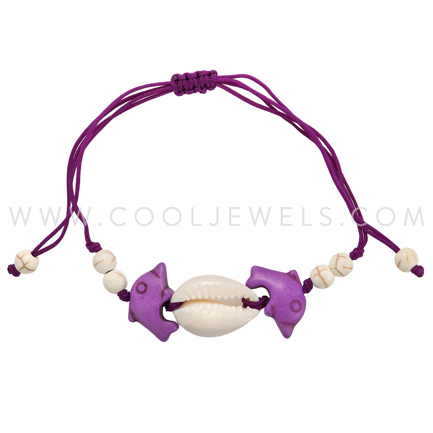 COLOR CORD SLIDER BRACELET WITH NATURAL COWRIE SHELL, DOLPHIN, AND NATURAL STONE BEADS