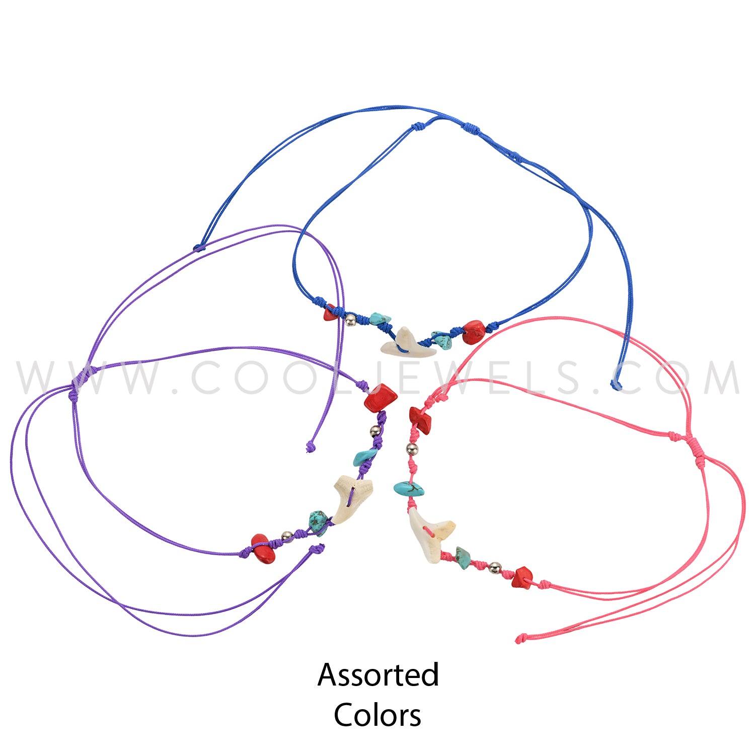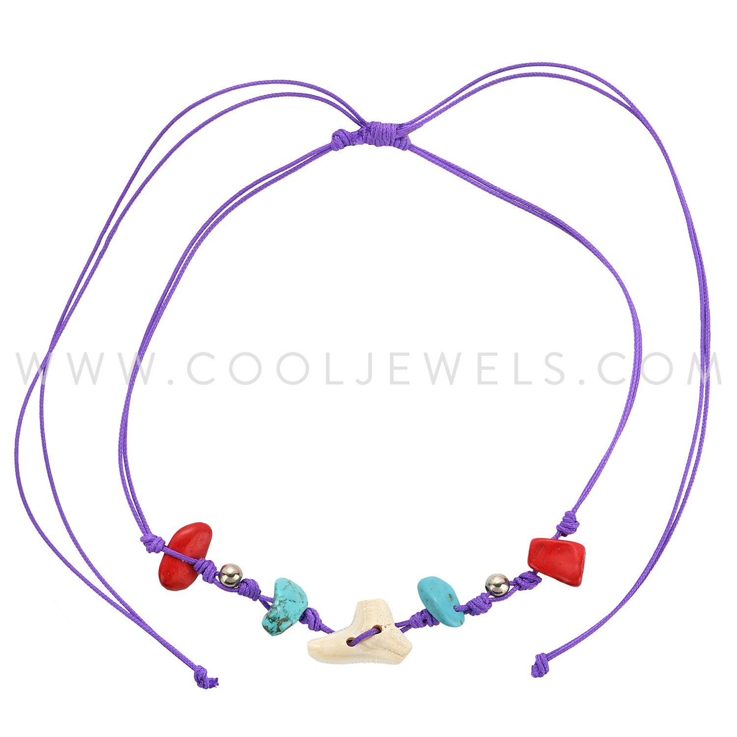 These Assorted Blue, Pink & Purple Beads & Imitation Shark Tooth Slider Cord Anklet features a slider cord anklet for easy sizing with multi-colored beads and a imitation shark tooth pendant.