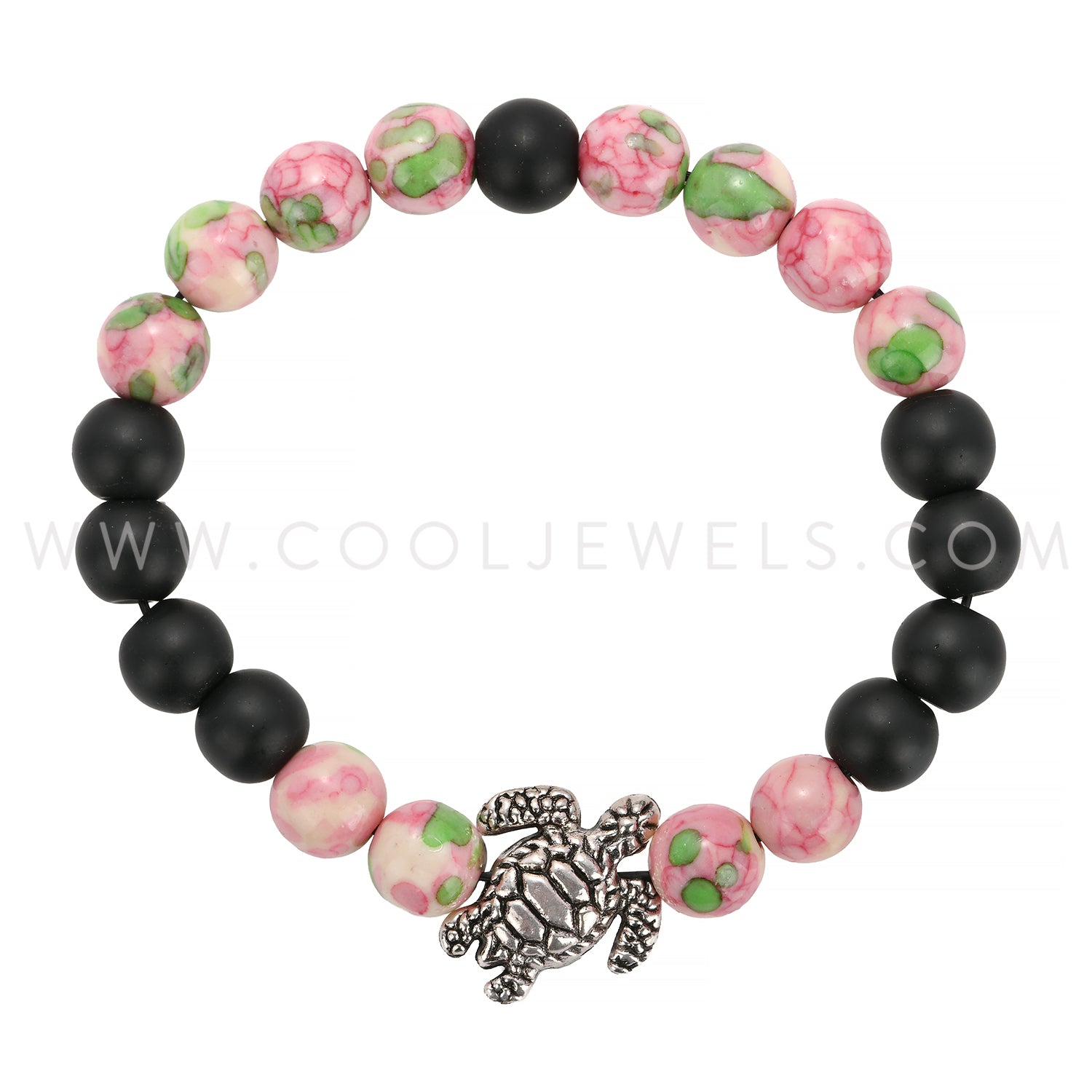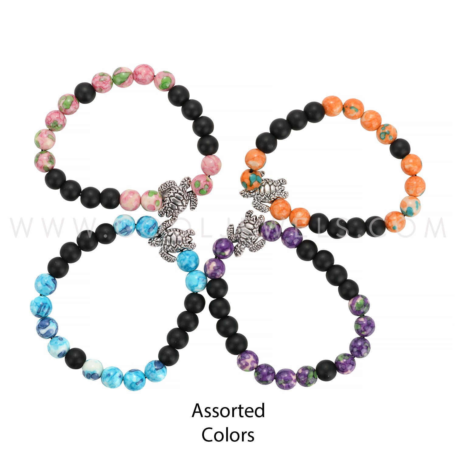 These Assorted Blue, Purple, Orange & Pink Black & Colored Beaded Bracelet w/ Turtle features black and multi-colored beaded stretch bracelet with a silver turtle pendant.