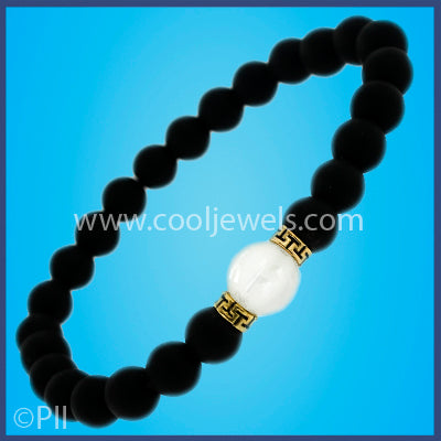 These beautiful Crystal & Black Beaded Stretch Bracelets feature a frosted crystal bead with symbols surrounded by black beads on a stretch bracelet.