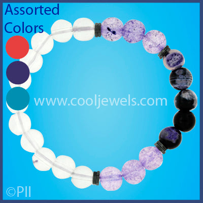 These Assorted Purple, Blue & Red Clear & Colored Beaded Bracelets feature a clear and multi-colored beaded stretch bracelet.