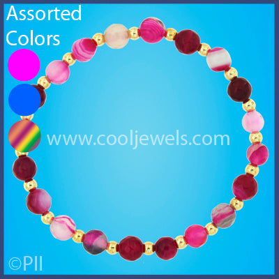 These Assorted Blue, Pink, & Rainbow Colored Precious Stone Bead Stretch Bracelets features colored precious stone beads with gold accents stretch bracelets.