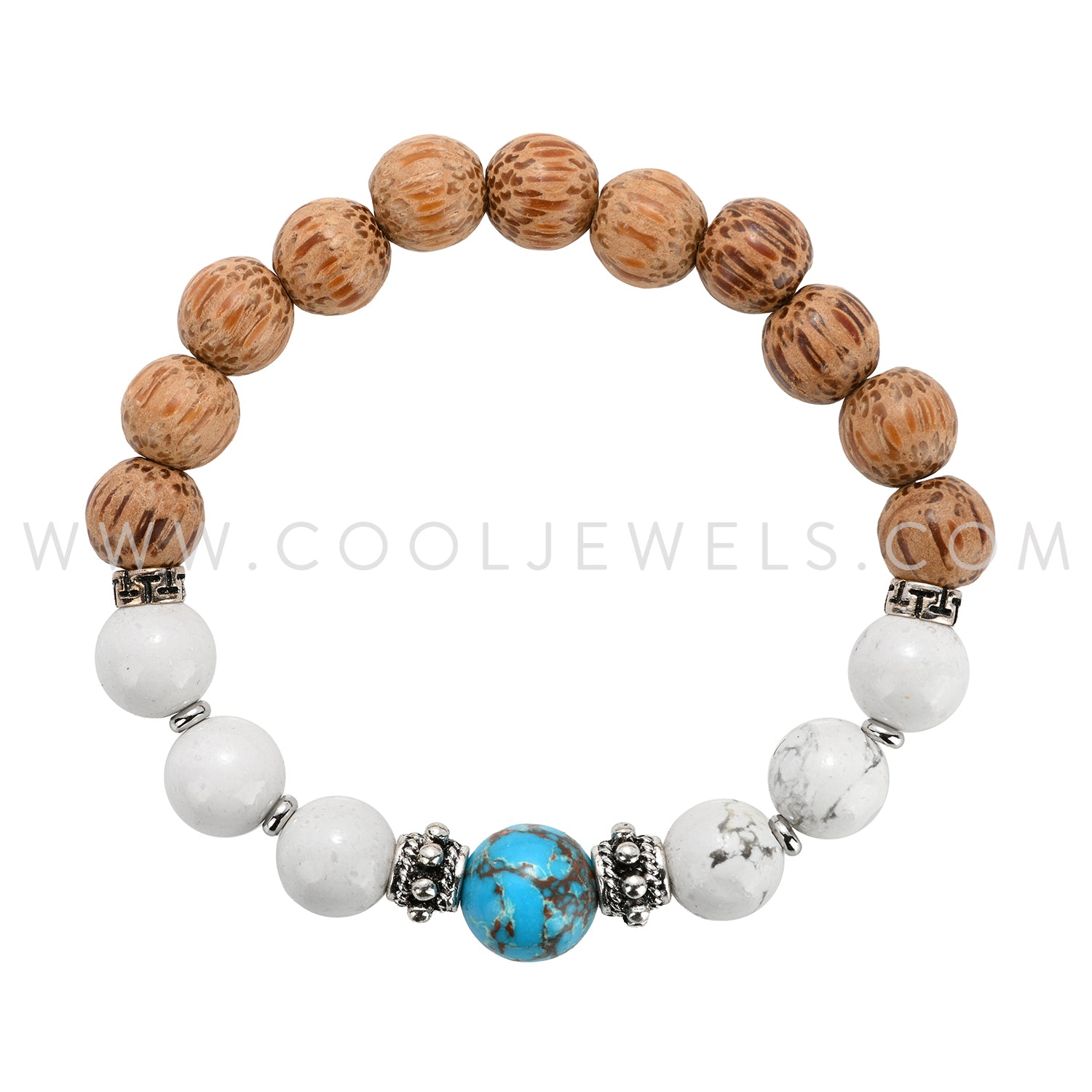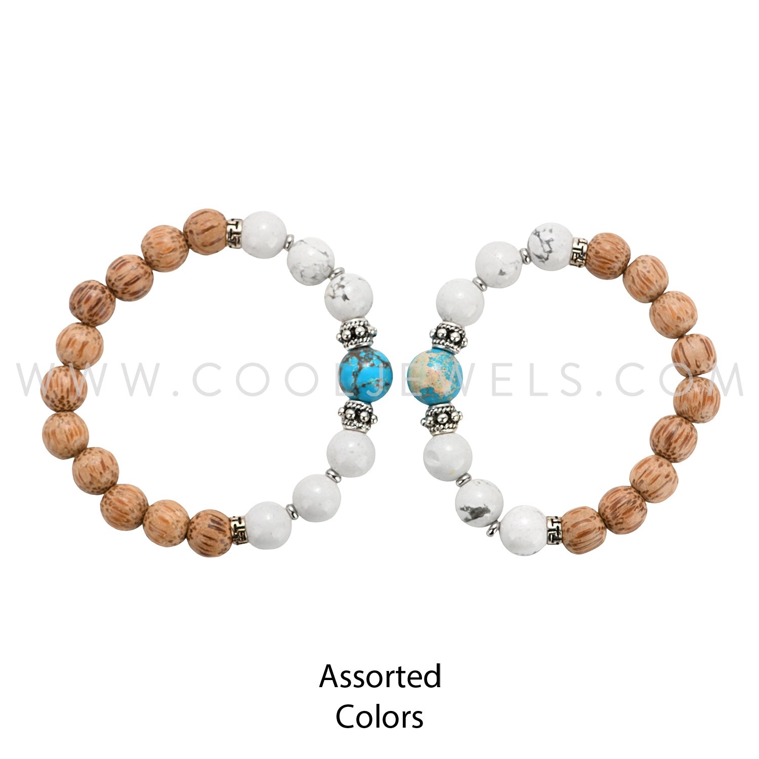 STRETCH BEADED BRACELET WITH PALM WOOD, HOWLITE, & TURQUOISE BEADS ASS'T - CARDED