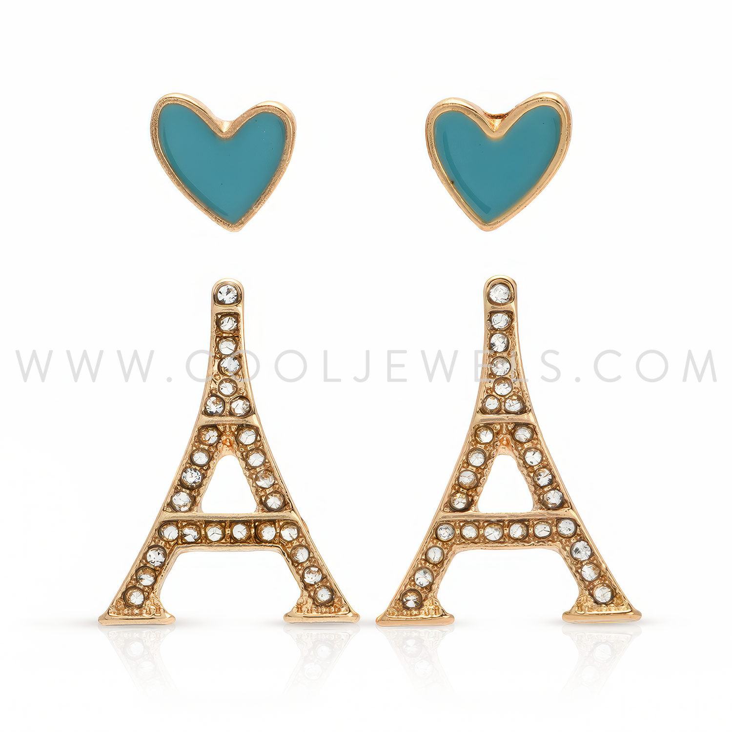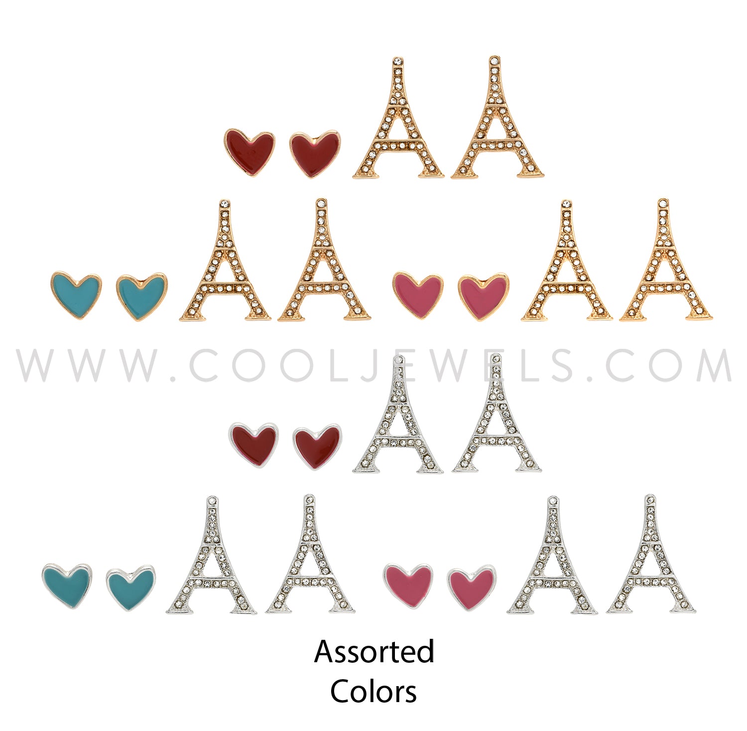 (SET OF 2) POST EARRINGS WITH RHINESTONE EIFFEL TOWER & HEARTS - ASSORTED