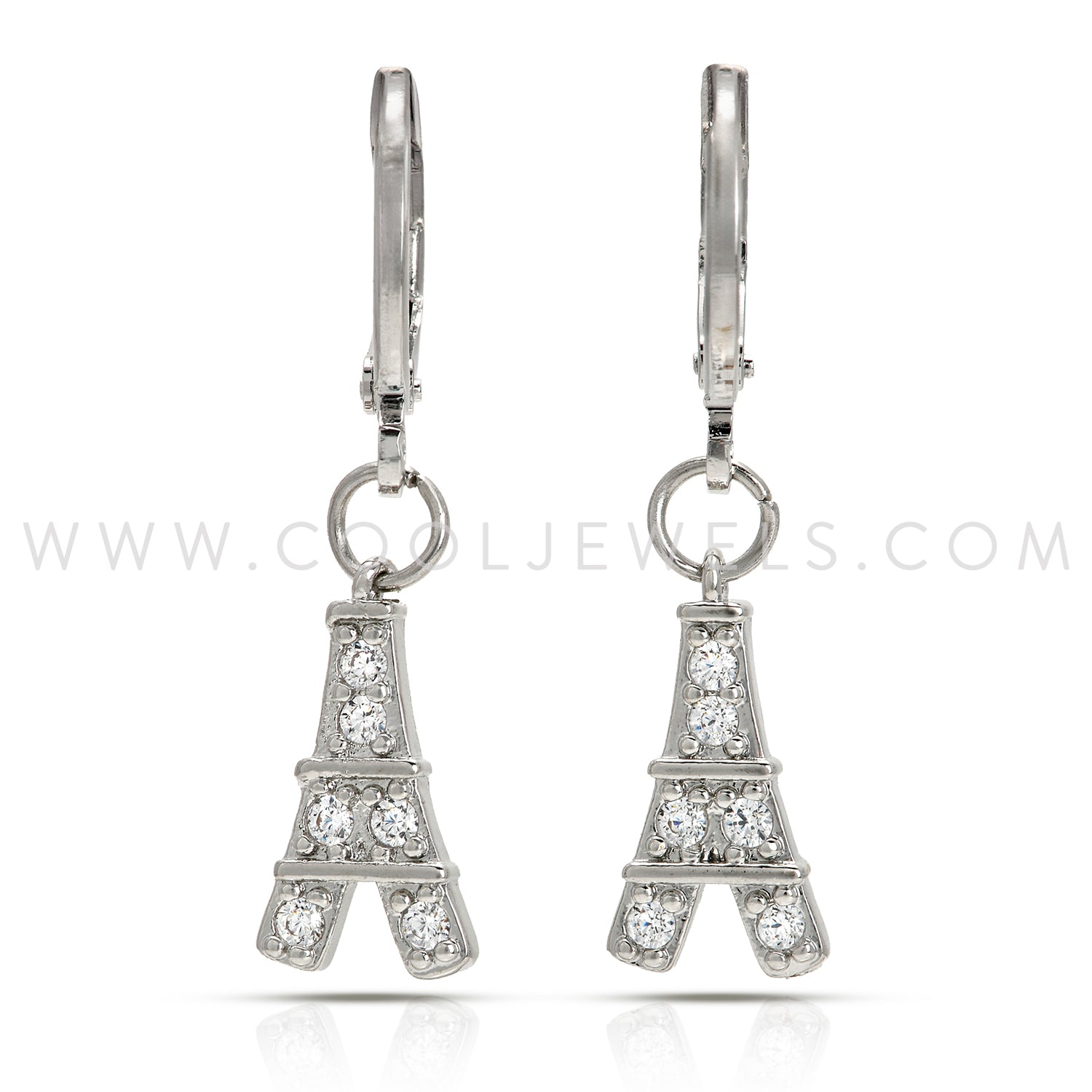 HUGGIE HOOP EARRINGS WITH RHINESTONE EIFFEL TOWER PENDANTS
