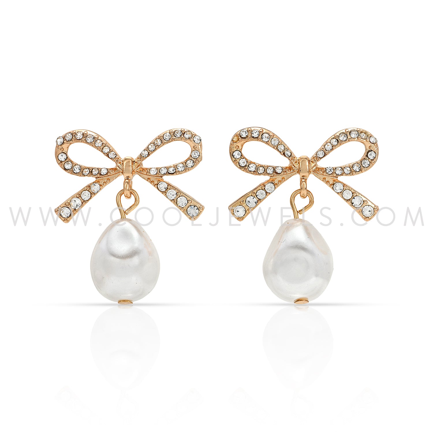 GOLD POST EARRINGS WITH RHINESTONE BOW AND PEARL BEAD