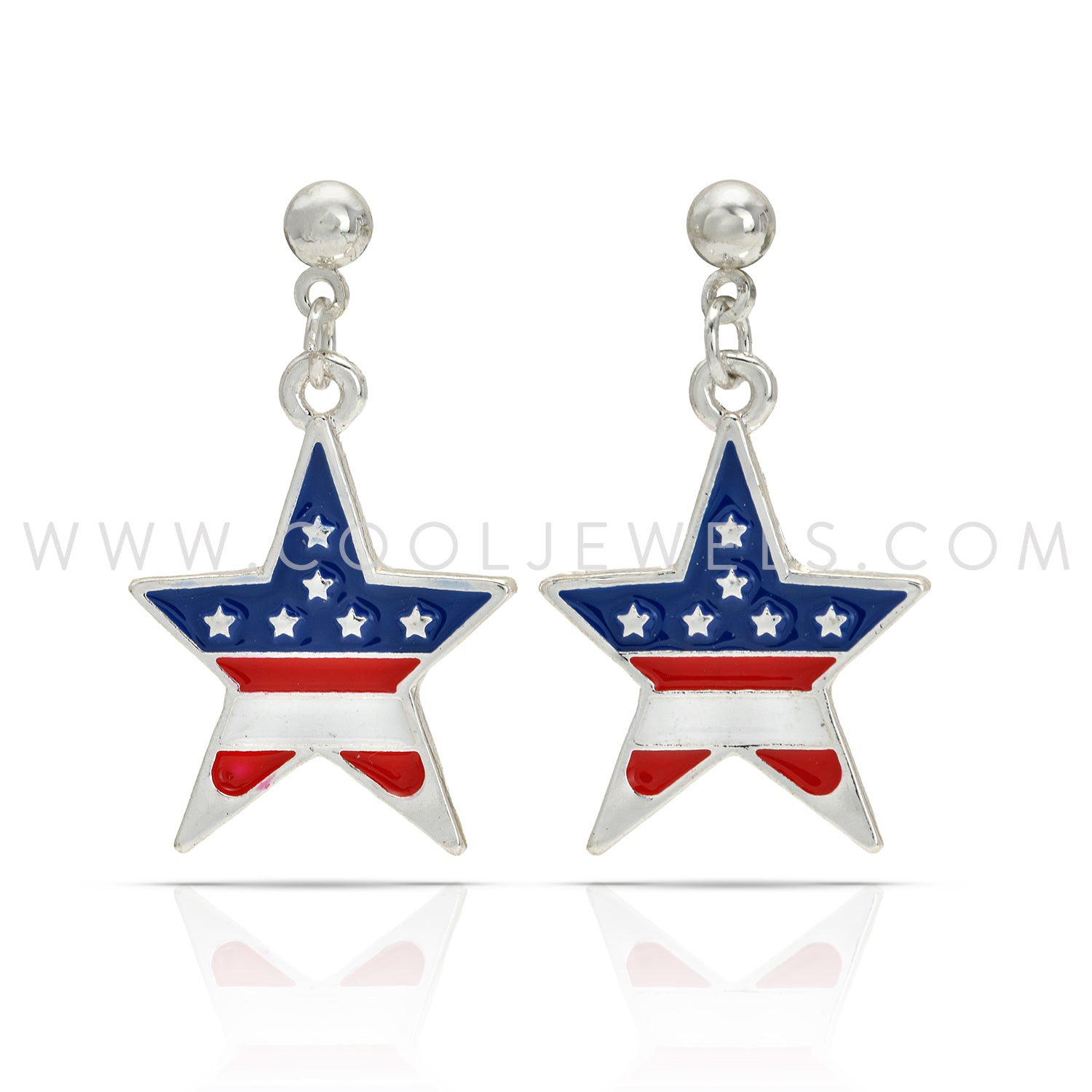 These American Star Earrings feature a Flag Star Pendant measuring .75" in width and .75" in length. The star has the American Flag pattern inside and silver stars and border.