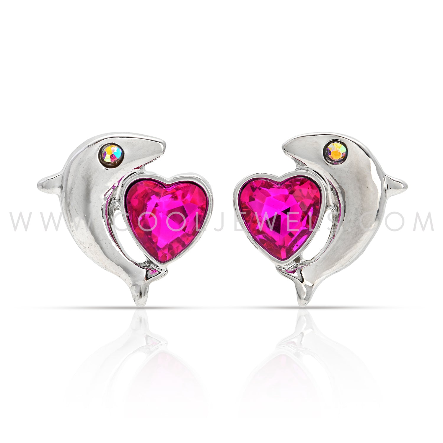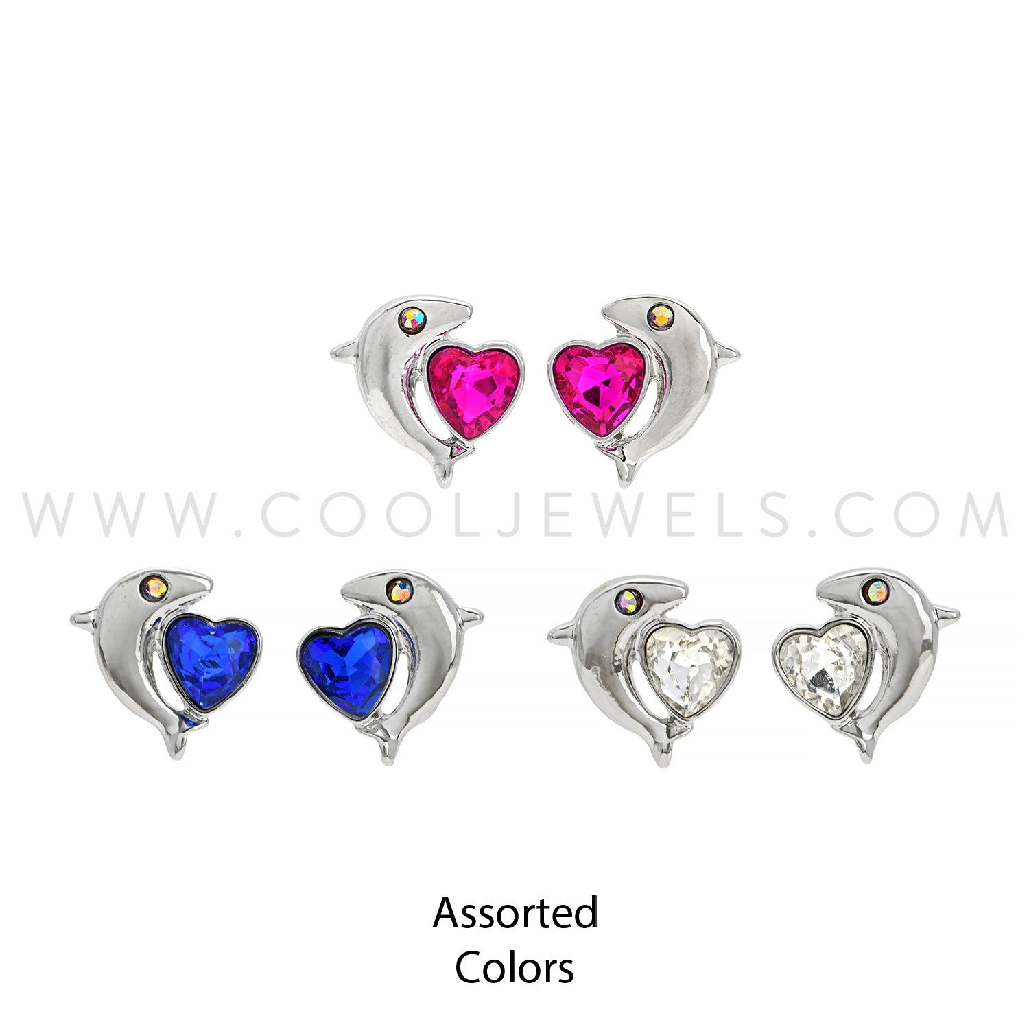 POST EARRINGS WITH DOLPHIN PENDANT WITH HEART SHAPED CRYSTAL - ASSORTED