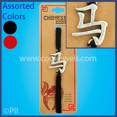 These cool Assorted Black & Red Chinese Zodiac Horse Slider Bracelet features the Chinese symbol pendant on a woven slider cord bracelet for easy sizing.Chinese Zodiac jewelry comes on premium kraft packaging with fun facts about each zodiac sign on the back!