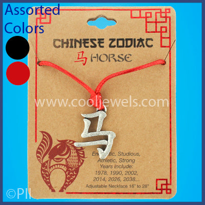 These cool Assorted Black & Red Chinese Zodiac Horse Slider Necklace features the Chinese symbol for horse pendant on a slider cord necklace for easy sizing.Chinese Zodiac jewelry comes on premium kraft packaging with fun facts about each zodiac sign on the back!