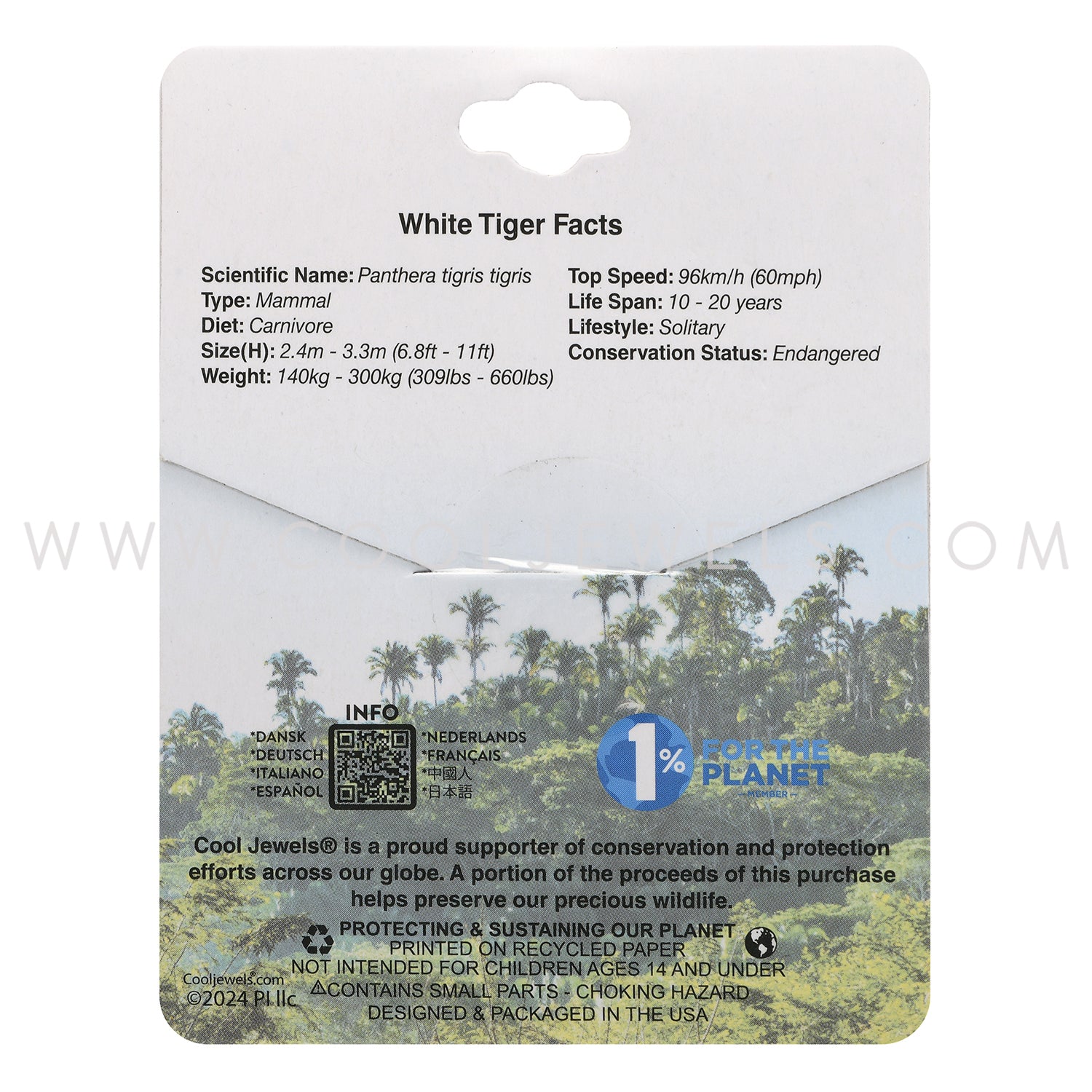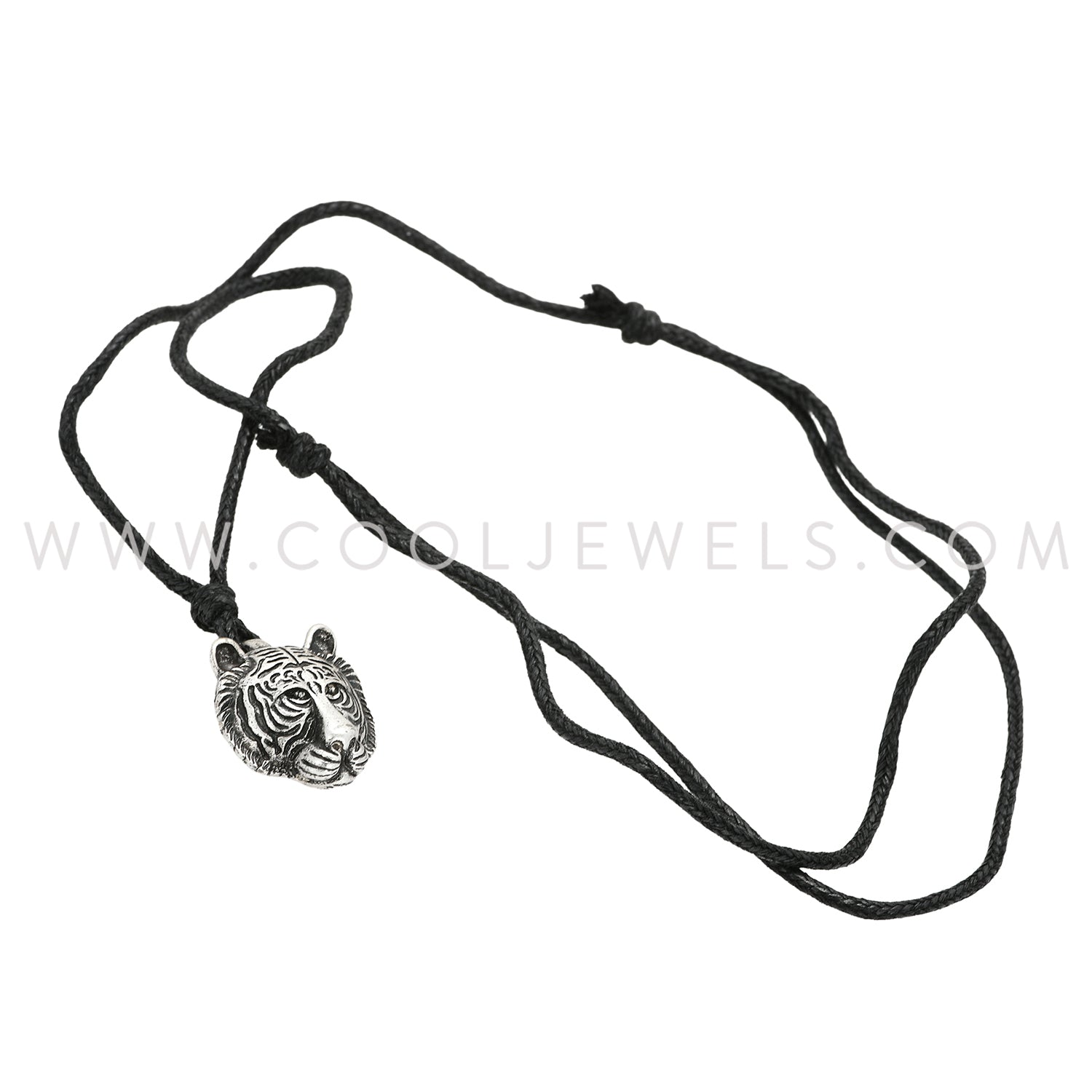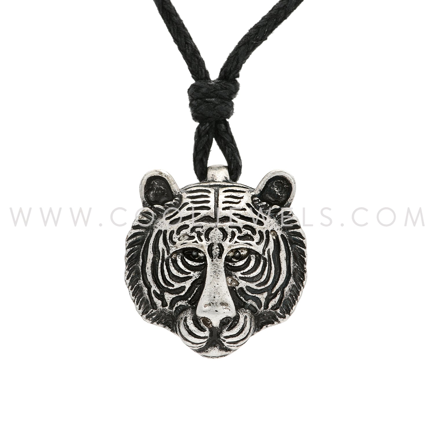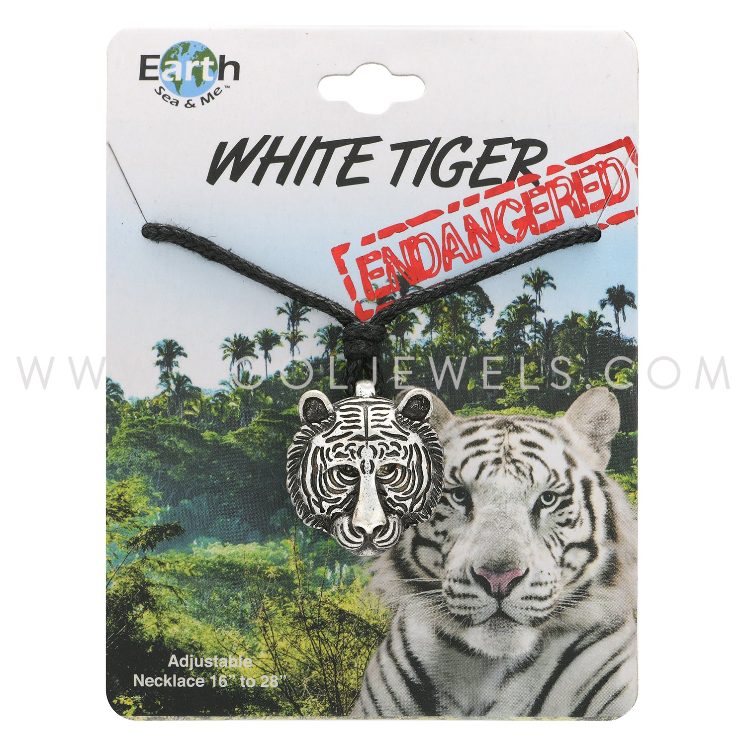 These awesome Earth, Sea & Me White Tiger Necklace features an antiqued pewter white tiger head on a black slider cord necklace.