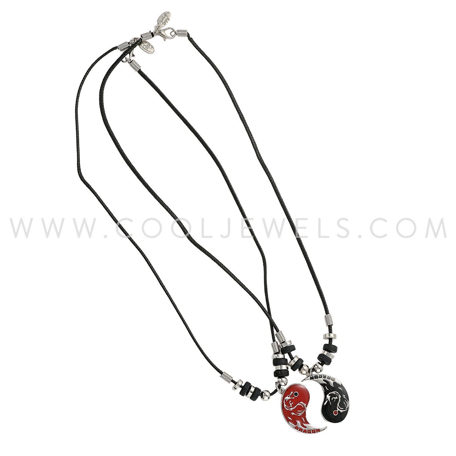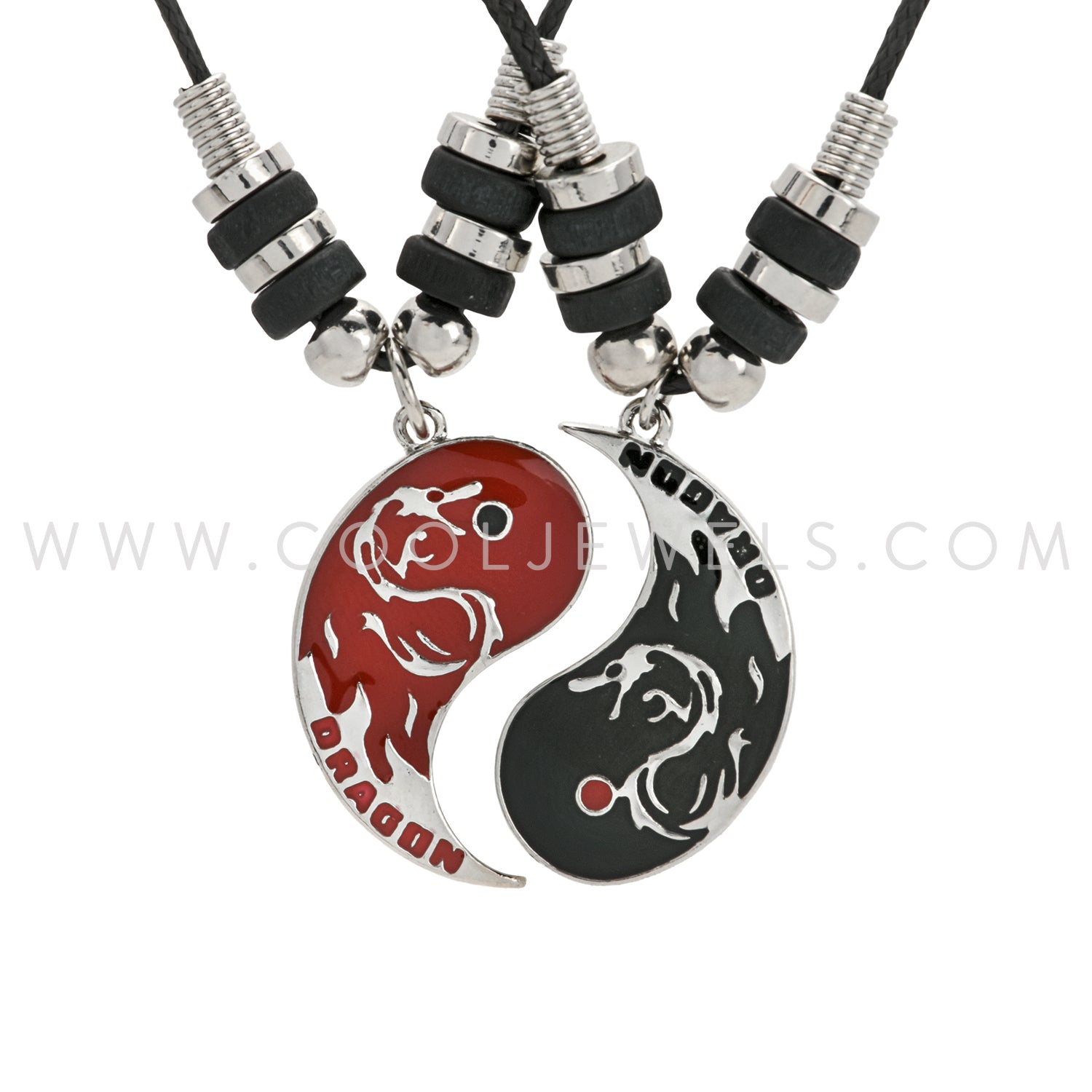 These Dragon Ying Yang Black Cord Necklaces feature a pair of one red and one black dragon ying yang pendant suspended on a black cord necklace.