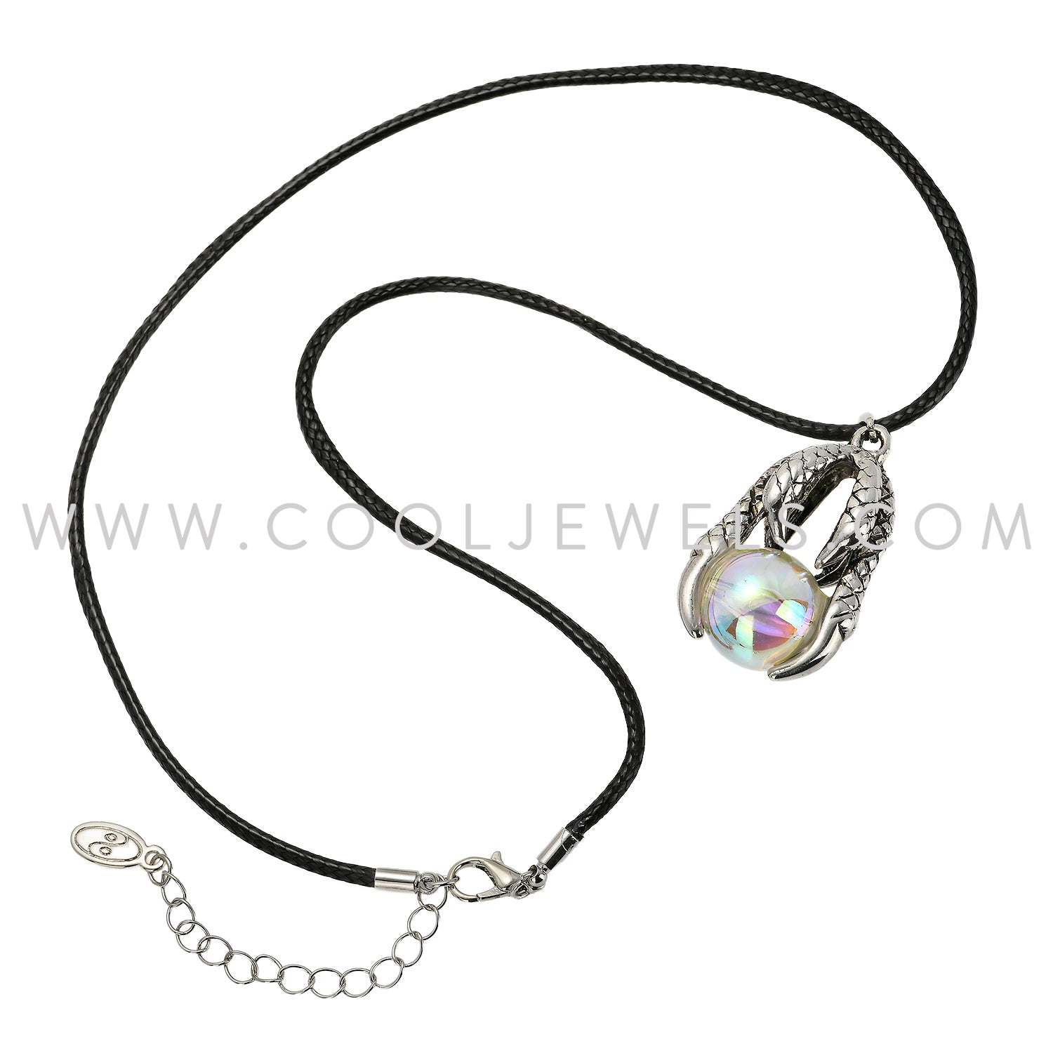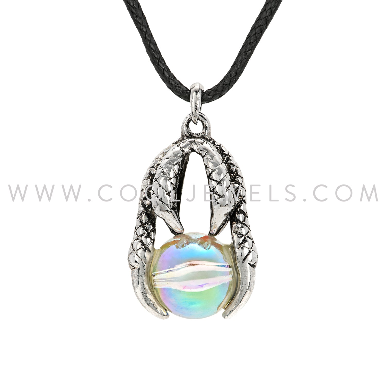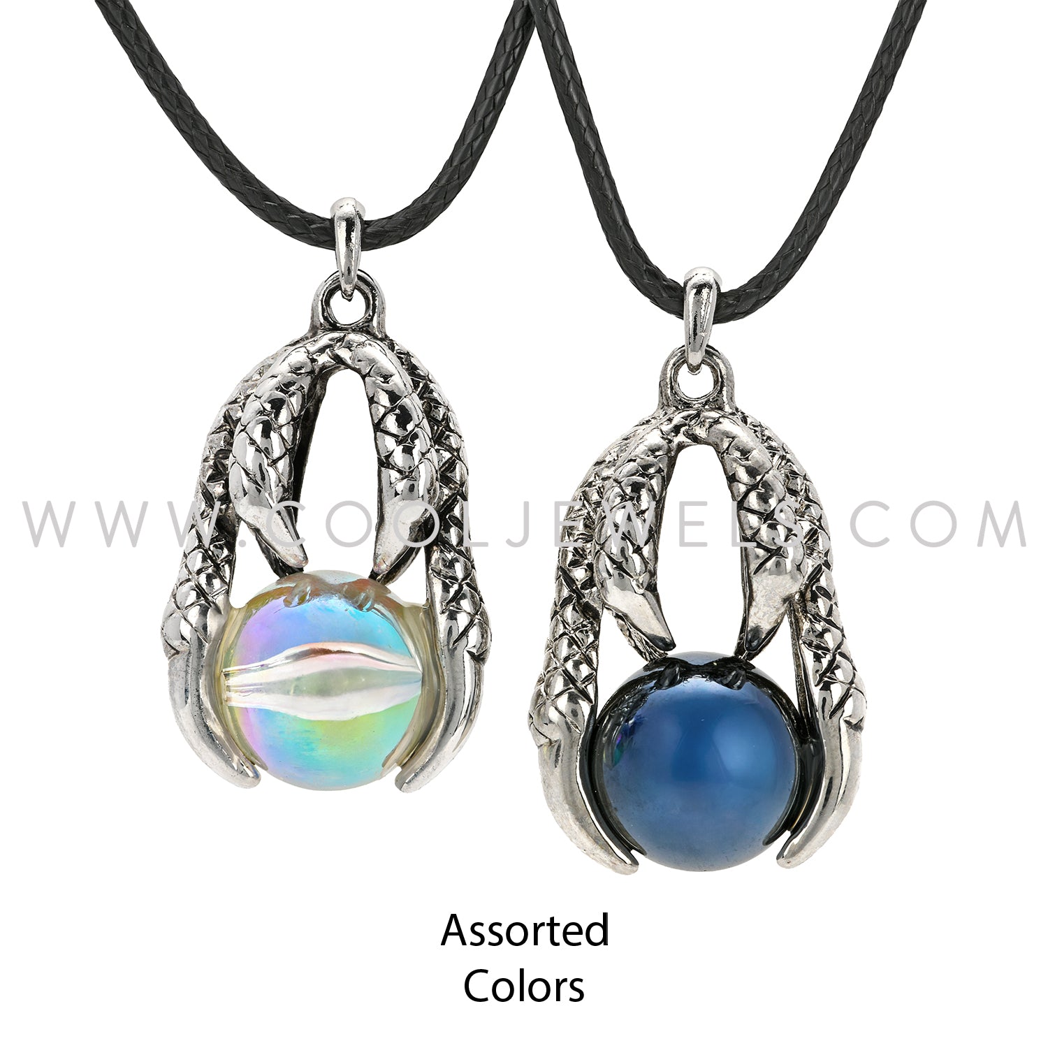 These cool Assorted iridescence Purple & White Claw & Colored Bead Cord Necklaces feature a claw grasping a colored bead suspended on a black cord necklace.