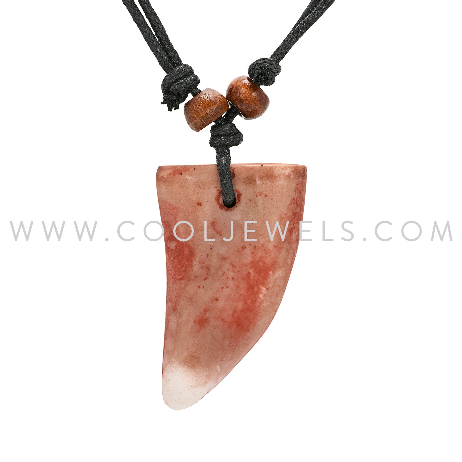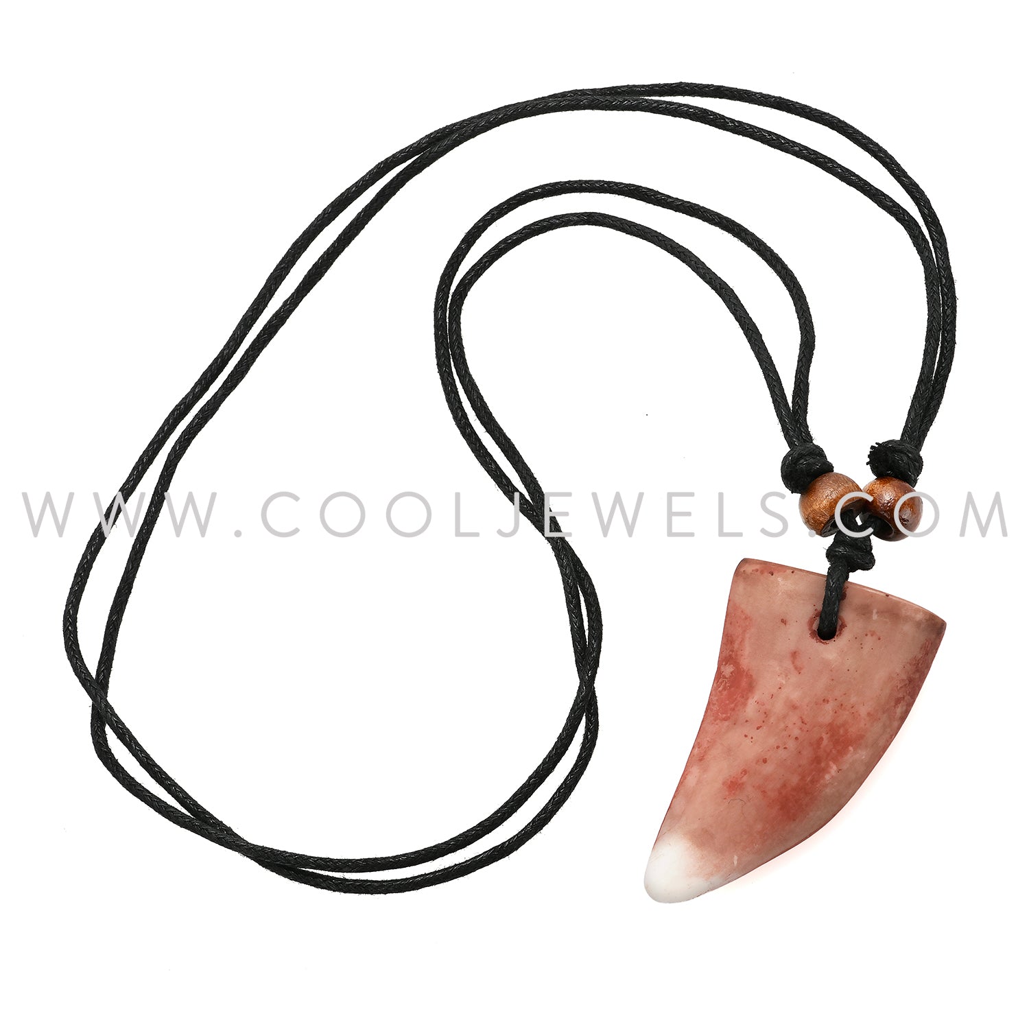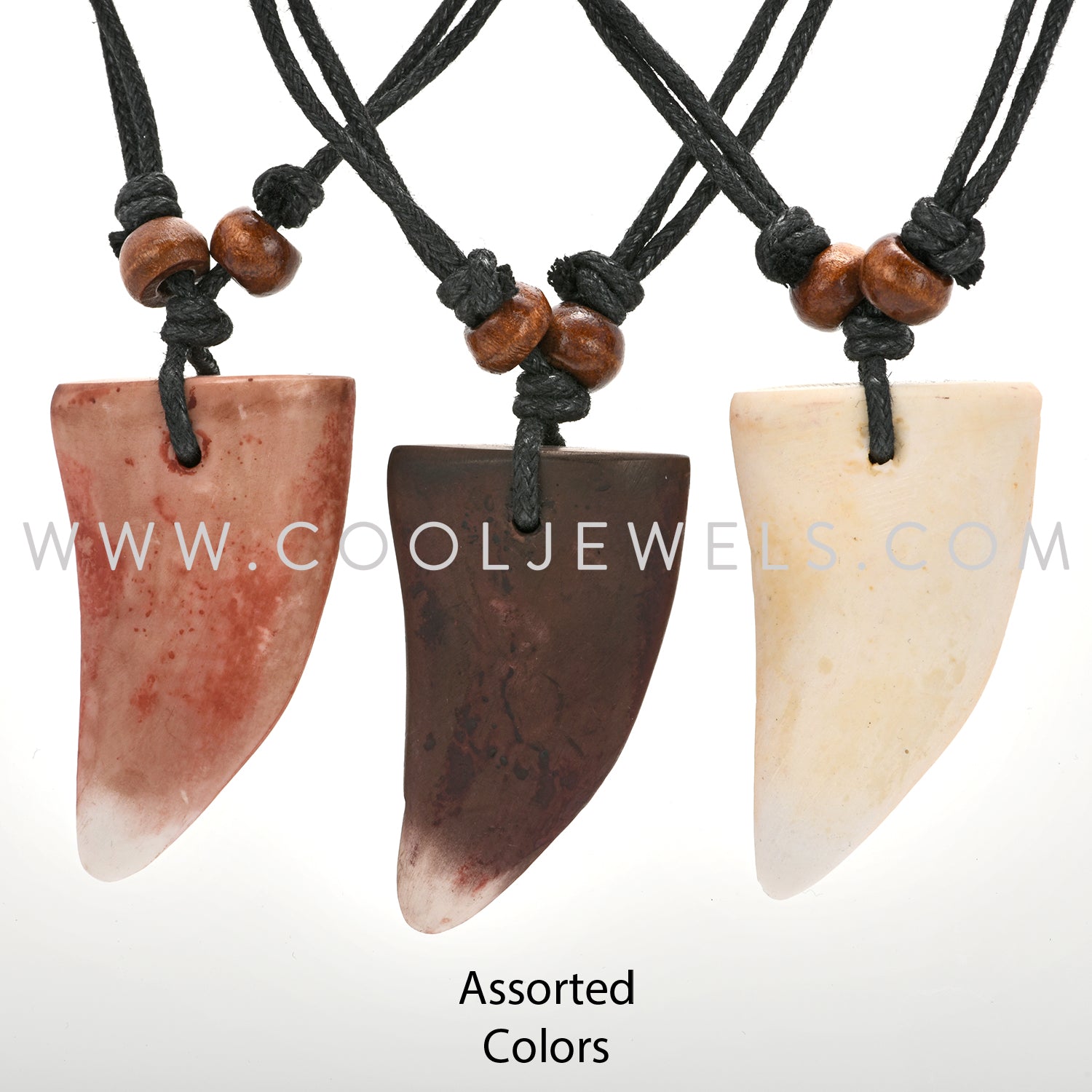 These Assorted Resin Tooth Necklaces feature a resin tooth pendant with different brown color variations strung on a black slider cord necklace.