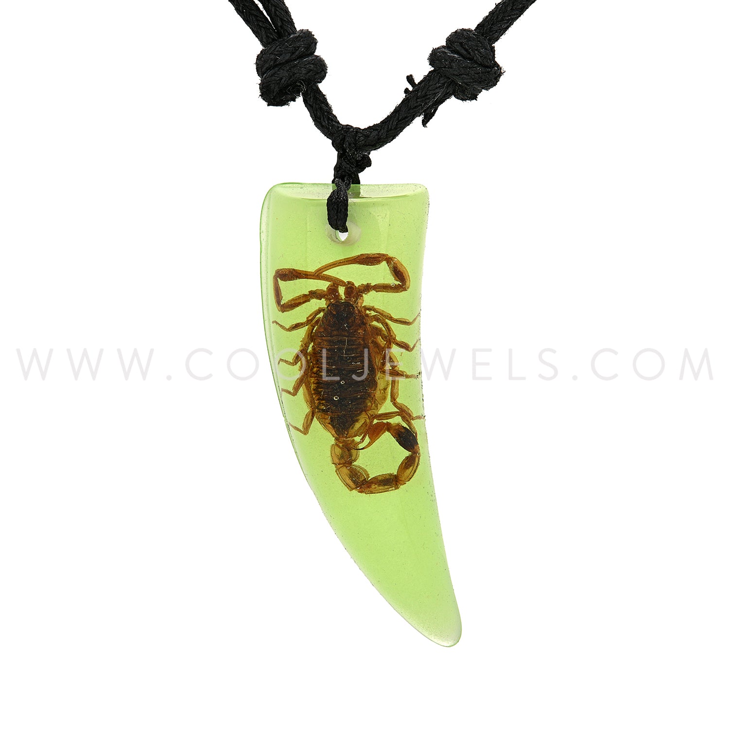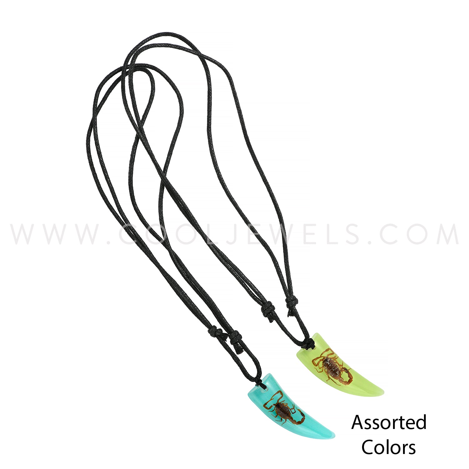These Assorted Green & Blue Scorpion Necklaces feature a black cord necklace with a scorpion pendant.
