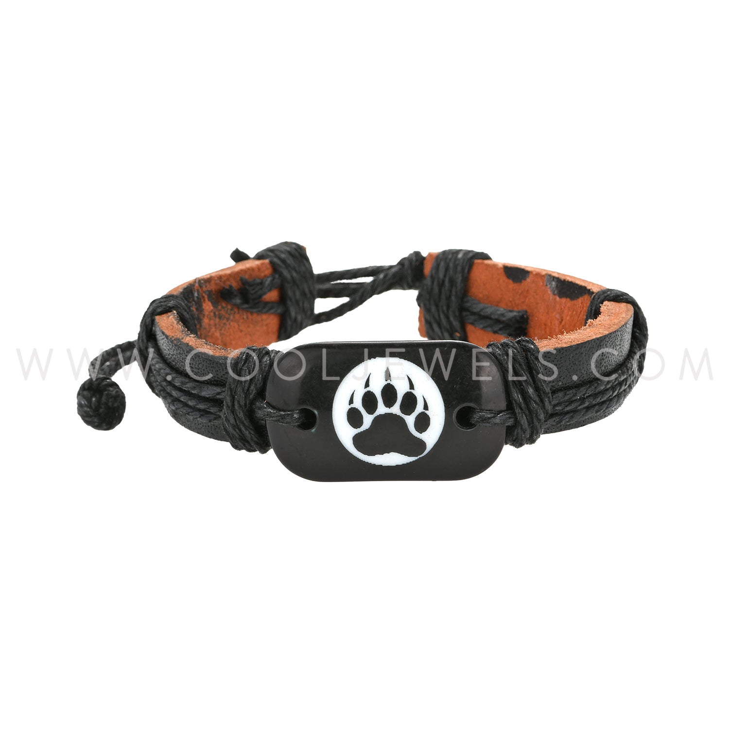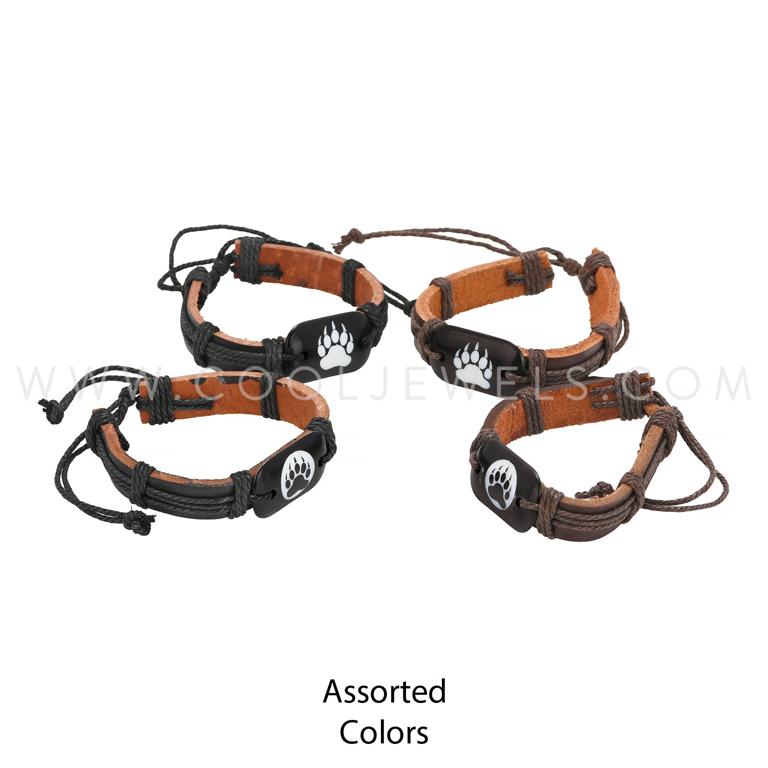 These Assorted Brown & Black Leather Bear Paw Bracelets feature two different bear paw designs on a leather slider bracelet.