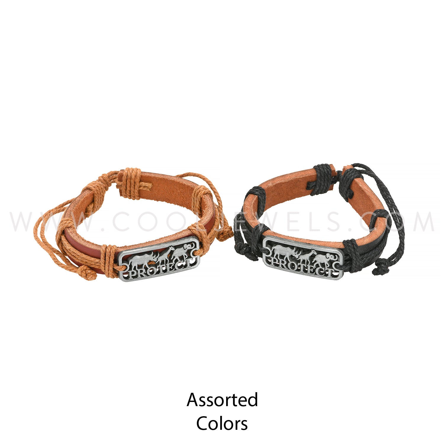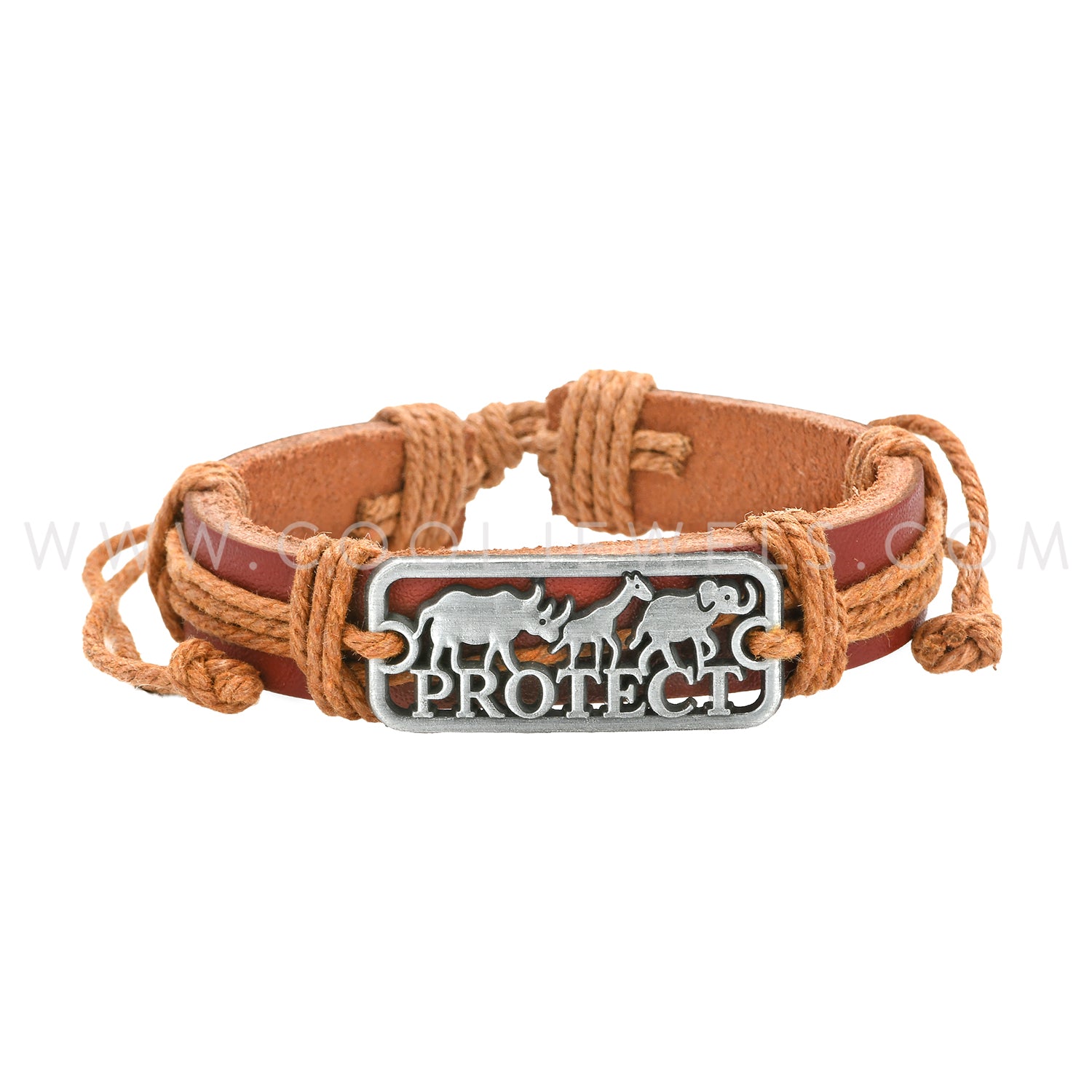 This Protect Leather Bracelet features a rhino, giraffe and elephant on the "Protect" pendant as well as rope to complement the leather.