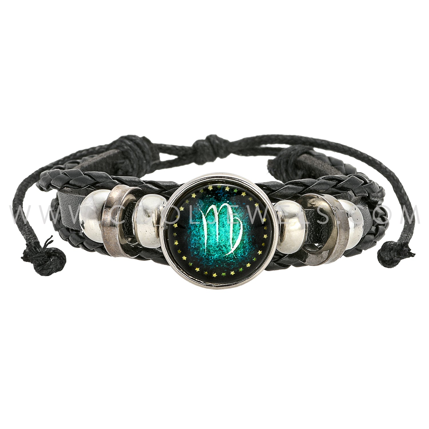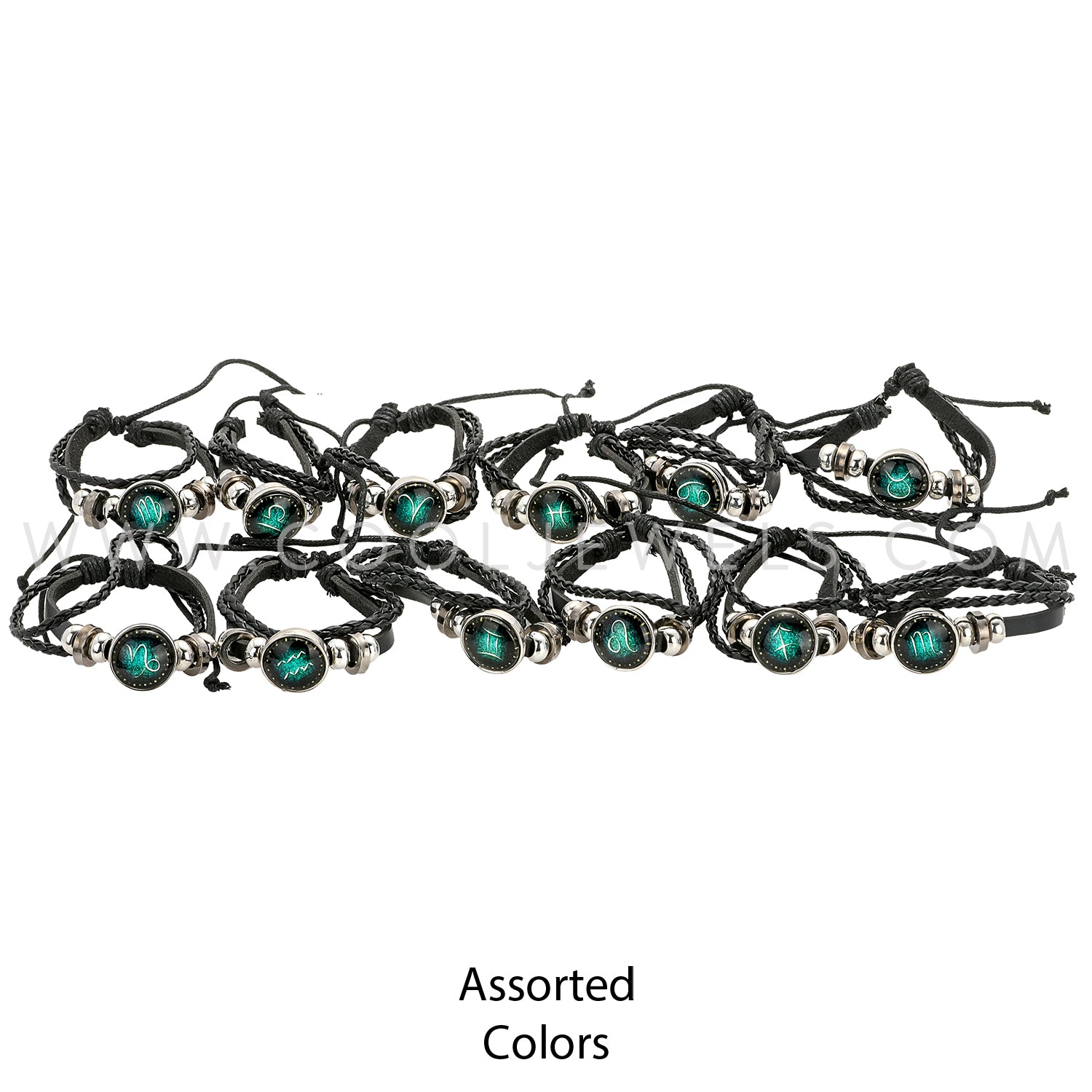 BLACK LEATHER & BRAIDED SLIDER BRACELET WITH ZODIAC DISC PENDANT - ASSORTED