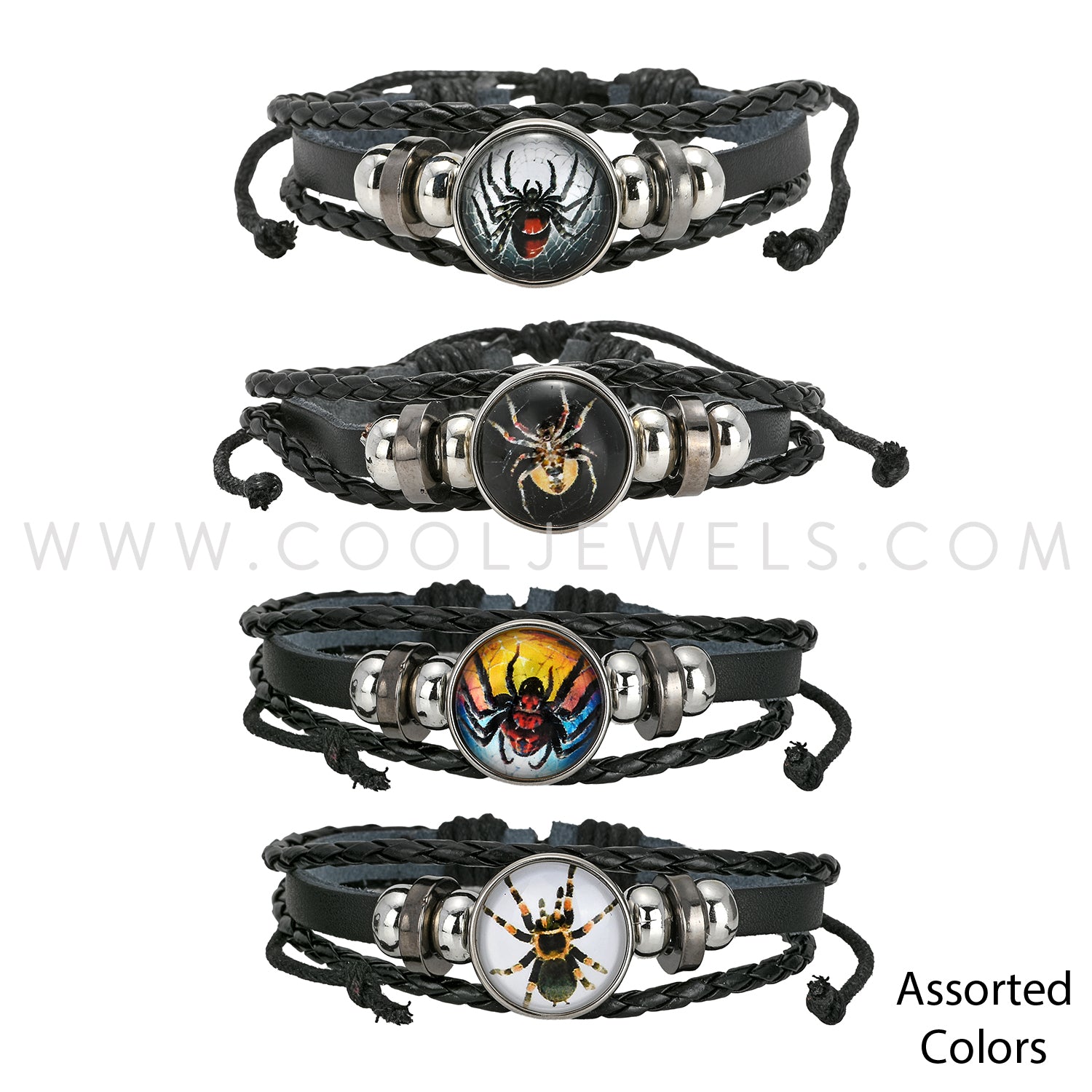 BLACK LEATHER & BRAIDED SLIDER BRACELET WITH SPIDER DISC PENDANT