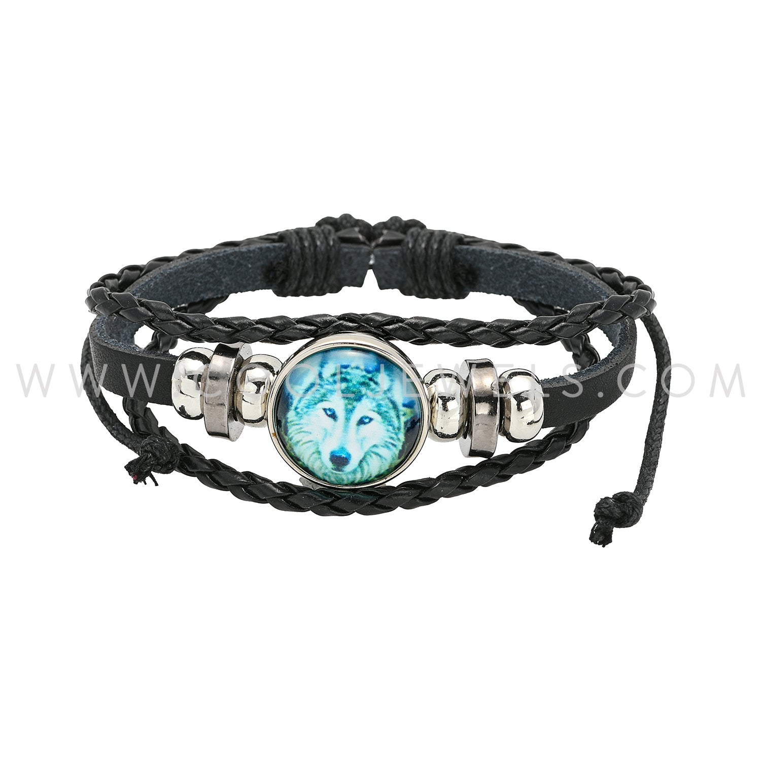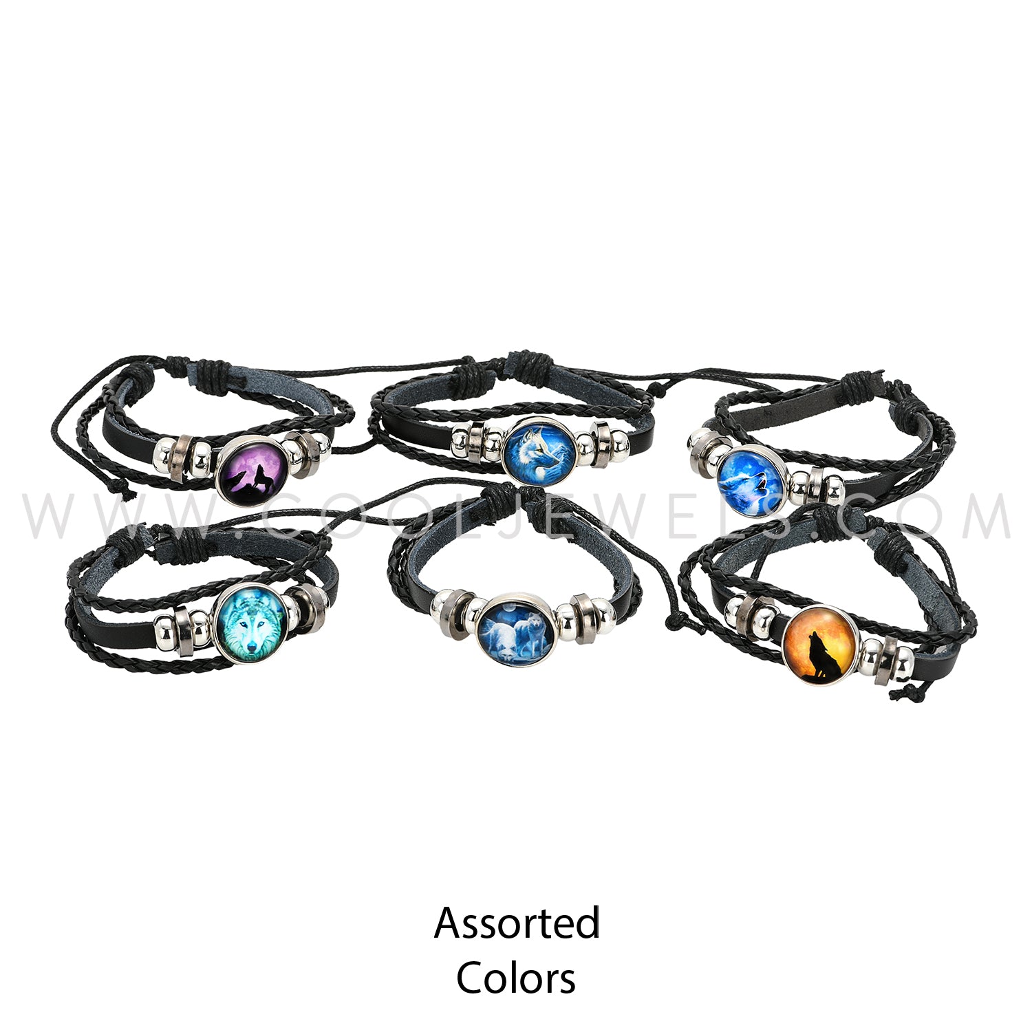 BLACK LEATHER & BRAIDED SLIDER BRACELET WITH WOLF DISC PENDANT - ASSORTED