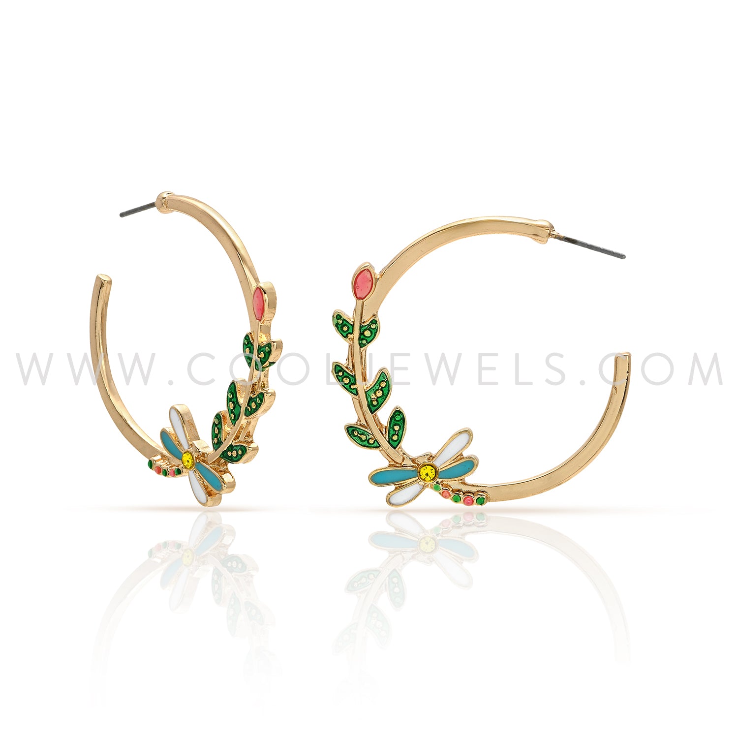 GOLD HOOP EARRING WITH DRAGONFLY & LEAVES