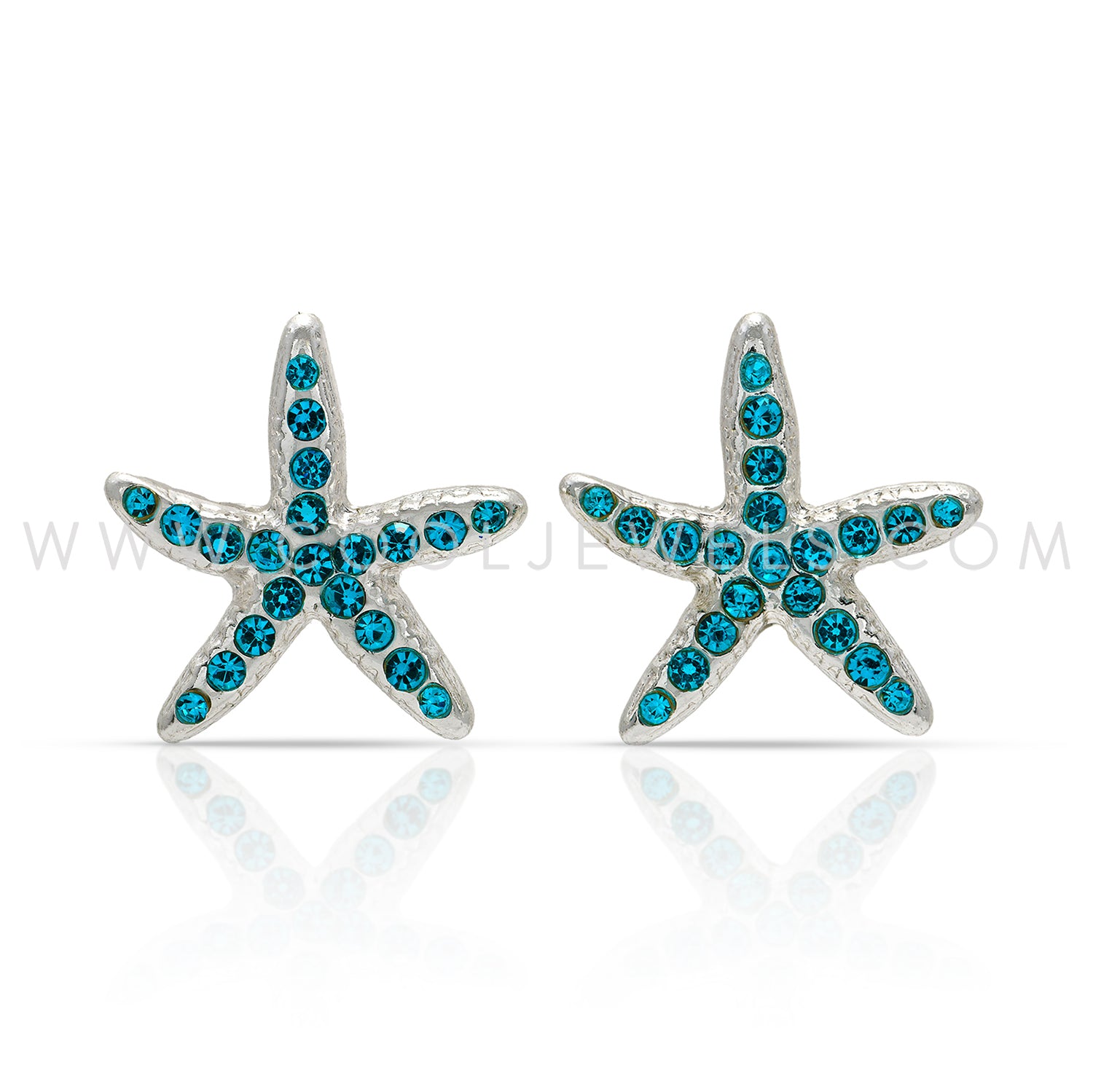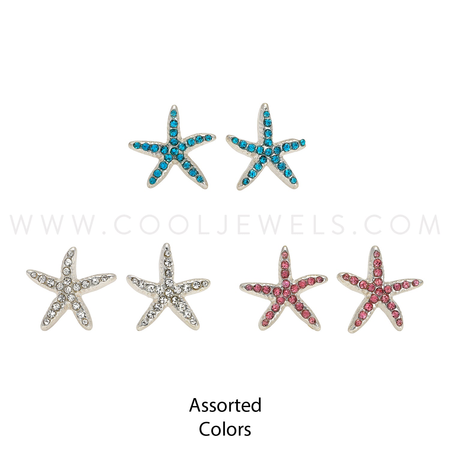 These Assorted Pink, Blue & White Color Rhinestone Starfish Earrings feature a variety of brightly colored starfish post earrings and are accented with colored rhinestones.